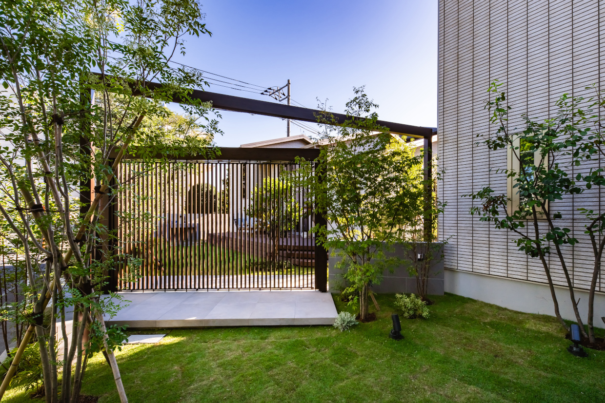 中の様子がほどよく見える格子のスライディングゲートが、庭への期待感を高めつつ、開放感も感じさせるデザインとなっています。
