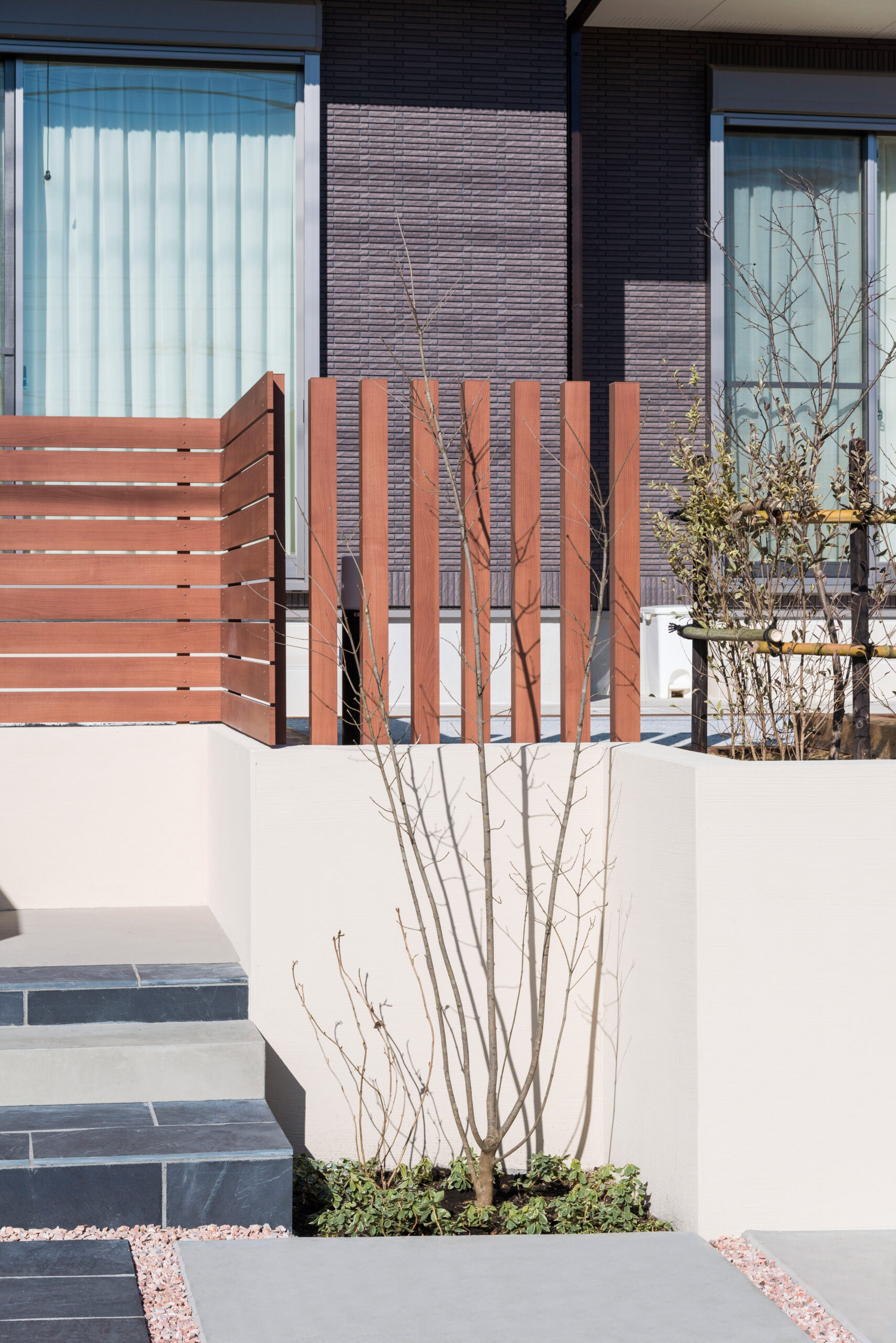 • 冬になり落葉した株立ちの木。背景には、アクセントの木の角柱を立てました。冬の景色も絵になります。