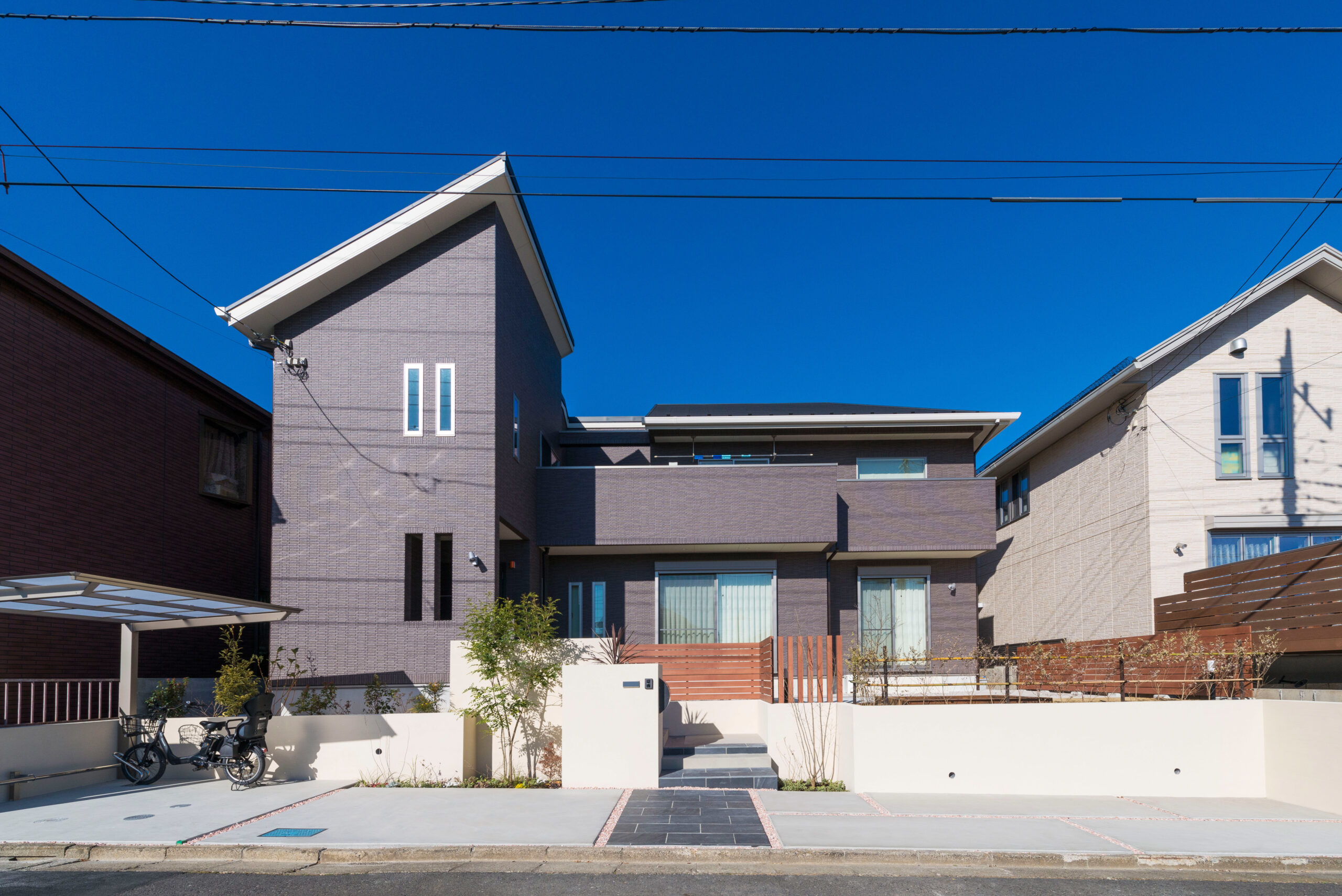 • お家の外観は、落ち着いたダークグレーで統一され、横に広がった形と、道路から、建物まで約1mの高低差がある特徴を持った敷地です。