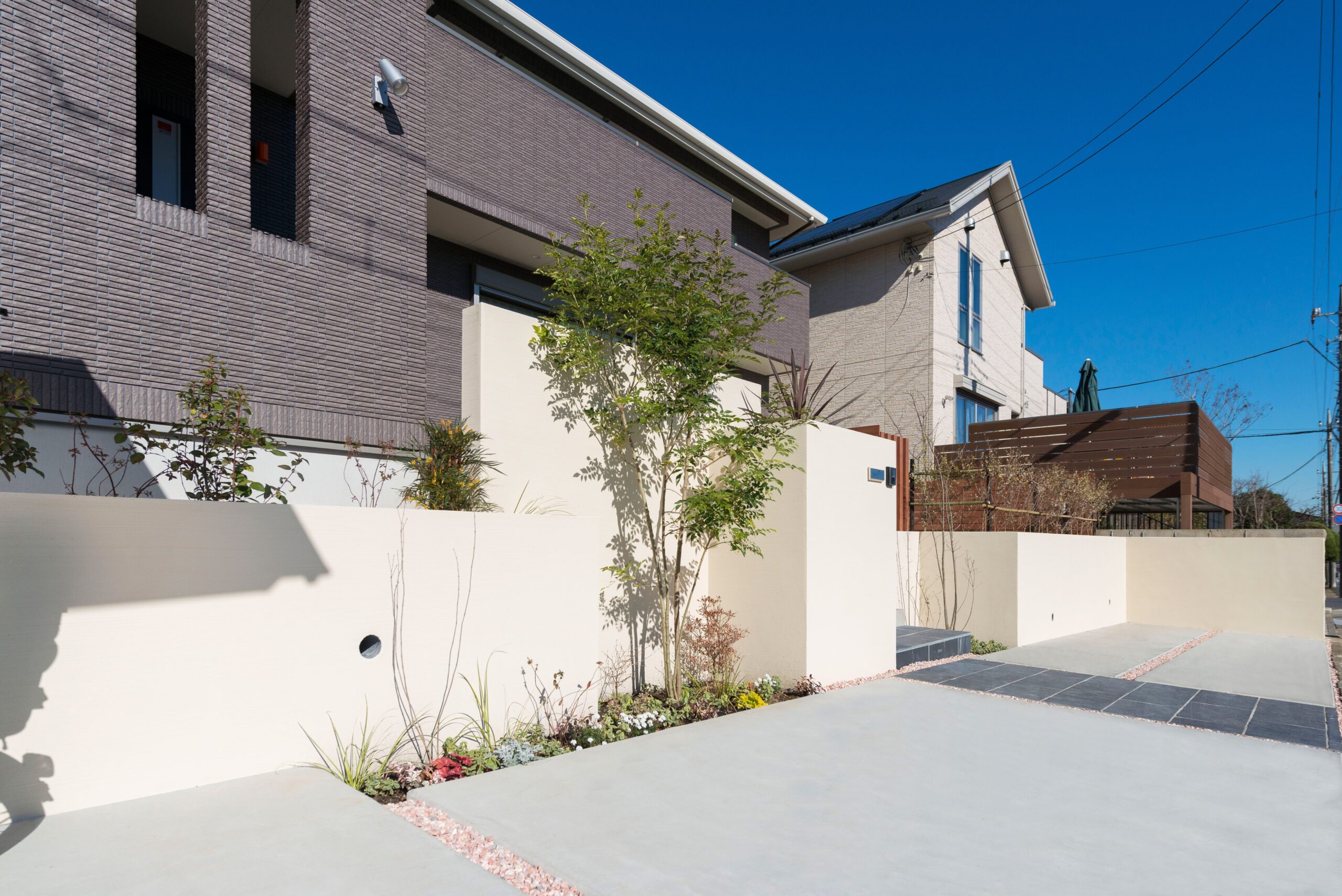 • 一番背の高いシンボルツリーは、1年中緑の葉をつけるシマトネリコです。背景の白い壁に緑がくっきりと映し出されます。シマトネリコの足元には、下草類を植える植栽帯を設けました。様々な植物が、玄関まわりに彩りを加えてくれます。