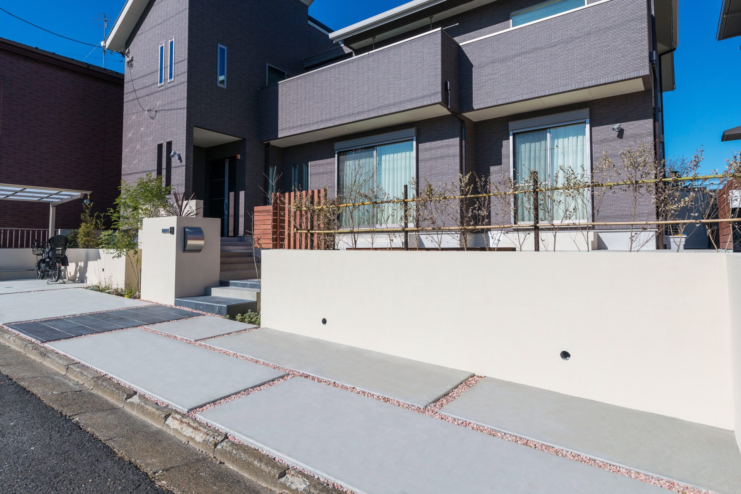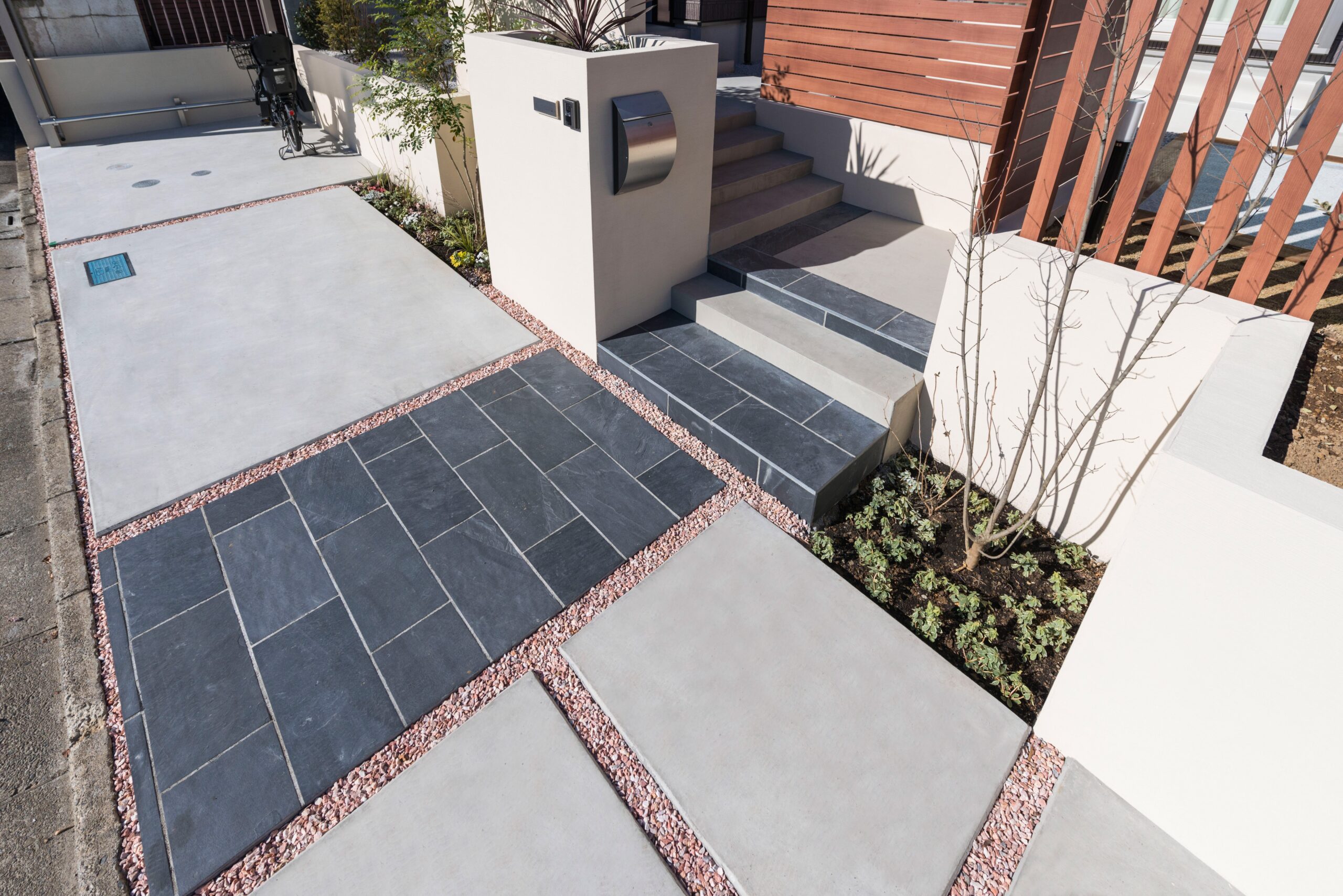 • ななめからの様子です。門袖は、正面に表札とインターフォン取付け、側面にポストを配置しました。スタイリッシュなデザインの表札とポストを採用しました。駐車場側の幅を確保することが目的です。階段の横幅が広いので、ポストは邪魔になりません。玄関までの動線を長く確保することで、奥行のあるゆったりとした階段が実現できます。