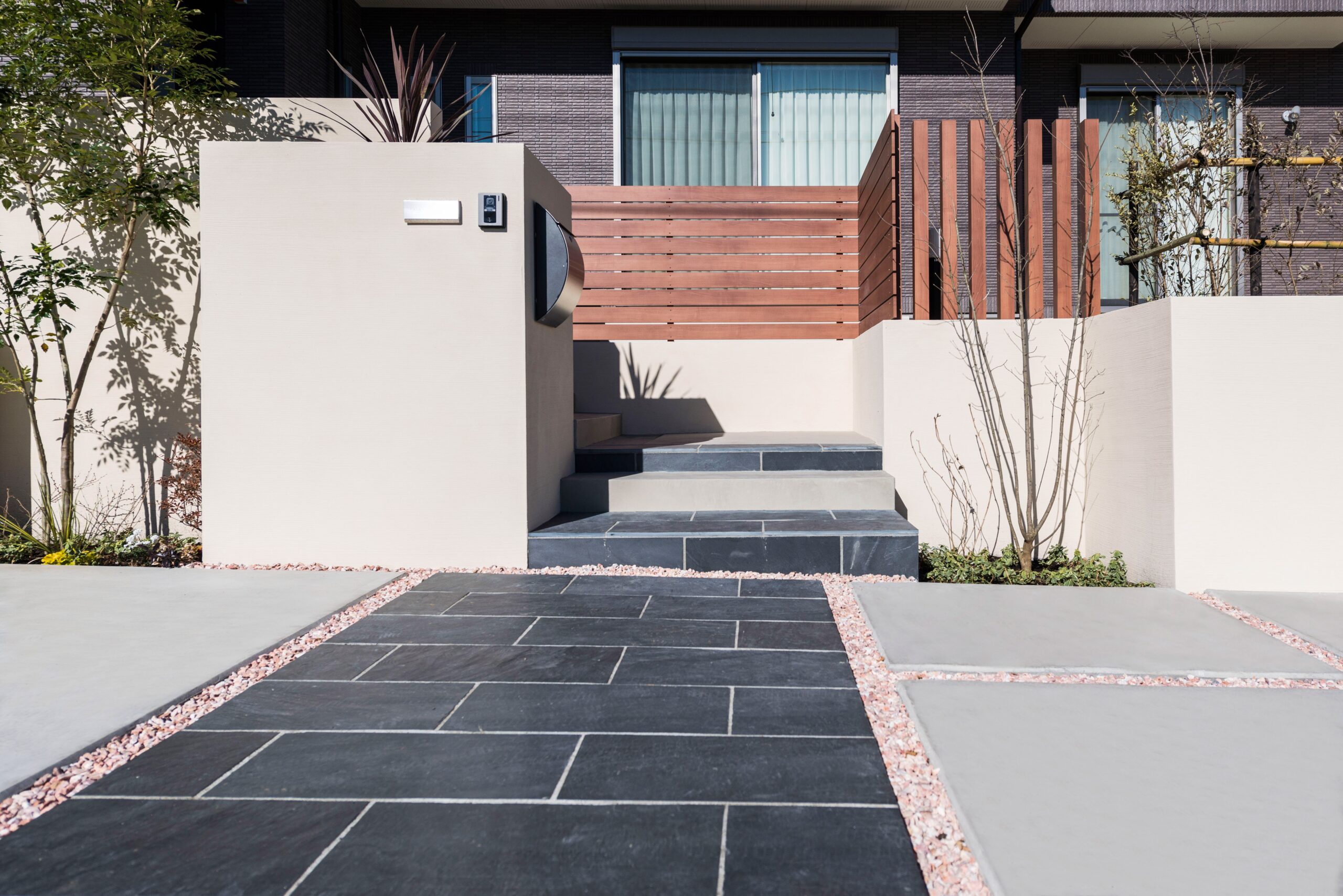 • アプローチと門まわりです。黒いタイルと木目調の組み合わせが際立ちます。L字に曲がり、玄関へと道が続きます。 門袖はシンプルなジョリパット仕上げです。両脇には常緑樹と落葉樹を1本ずつ、株立ちの木を植えました。