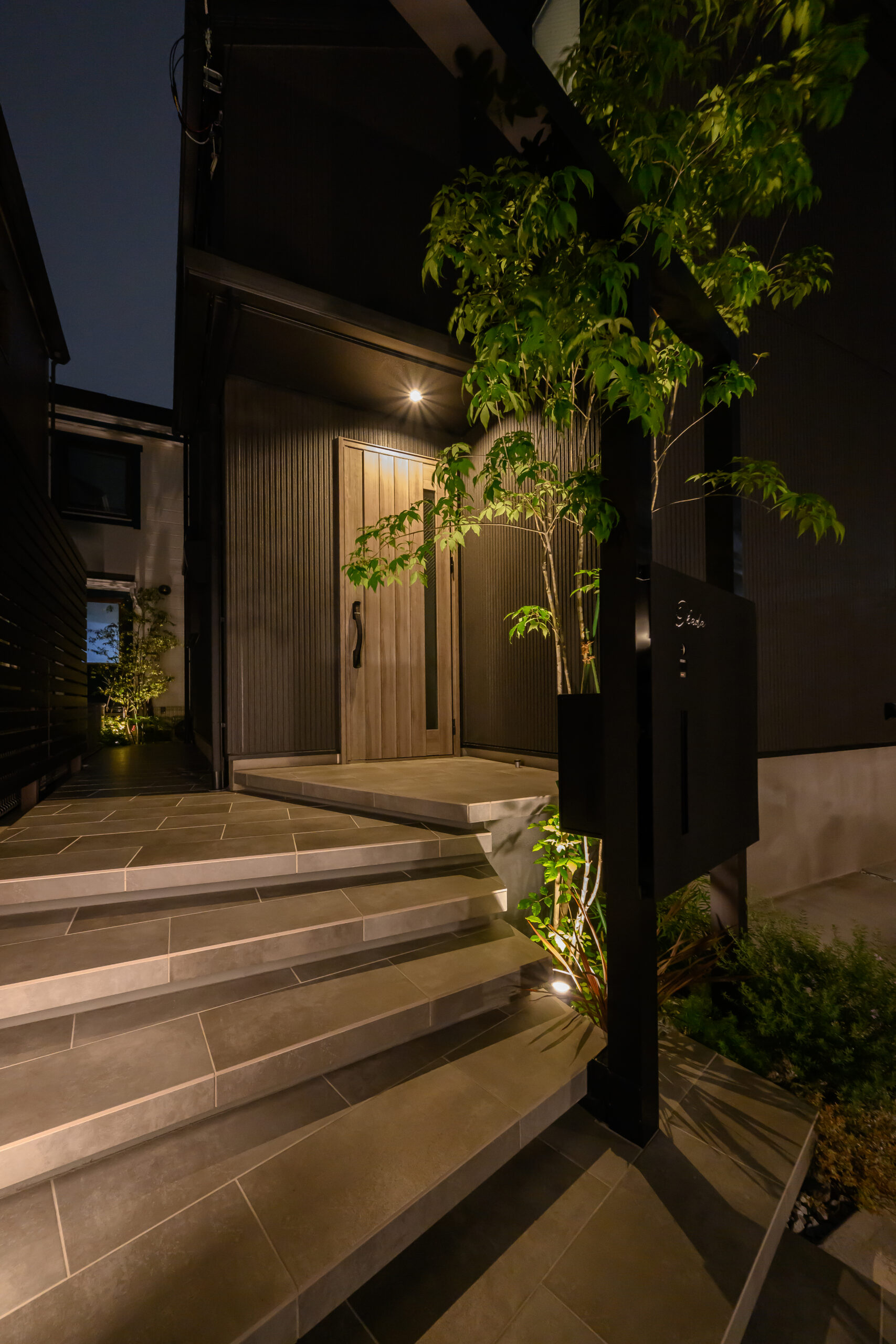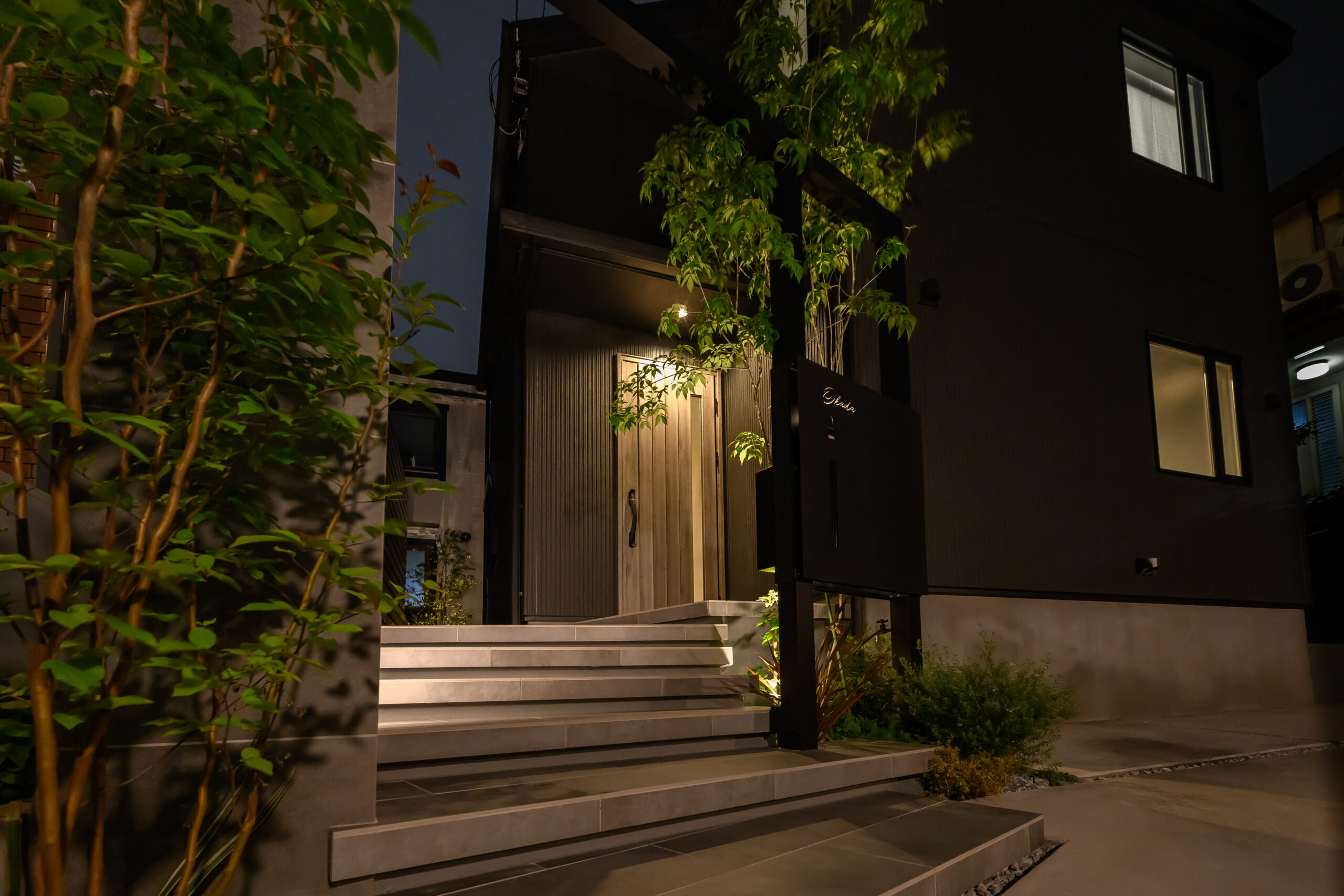 • 敷地に制限がある都心部だからこそ、ライティングデザインを重視しました。壁や植栽の奥に照明を設置することで、光と影のグラデーションが生まれ、実際の間口よりもはるかに深い奥行き感を演出しています。昼間とは異なる、幻想的で豊かな夜の表情も大きな魅力です。