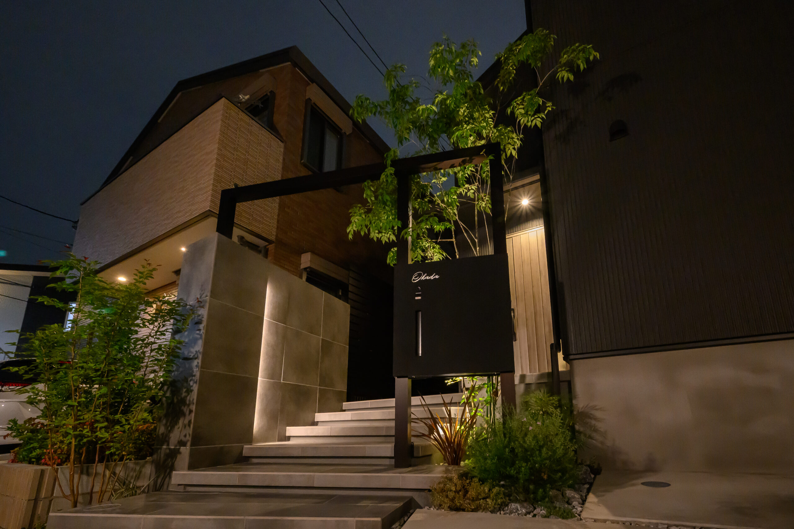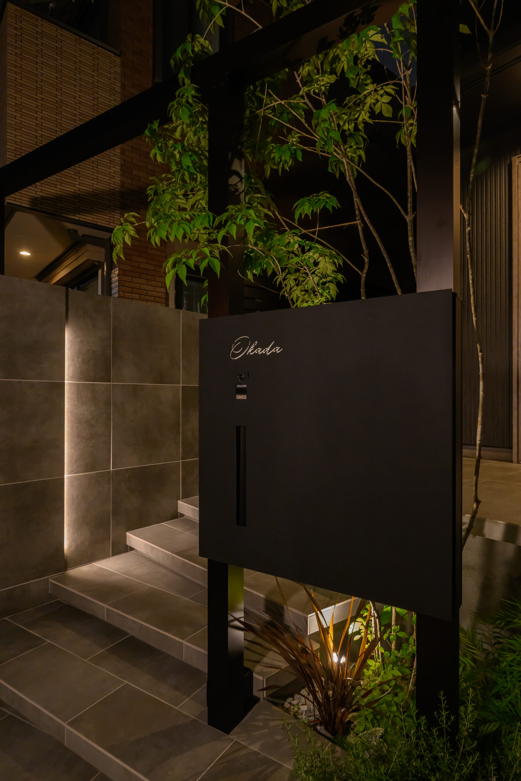 • 表札パネルには特注品を使用し、他の事例にはない「この邸宅だけのオリジナルファサード」を完成させました。細部にまでこだわったマテリアル選定が、唯一無二の表情を作り出しています。