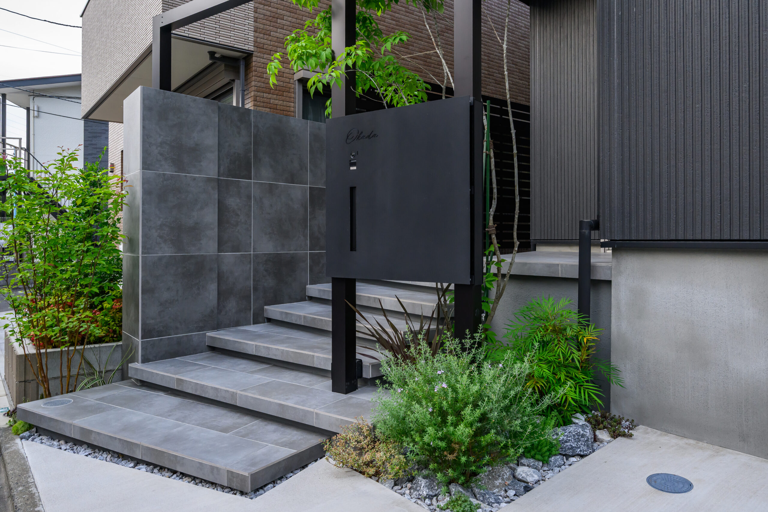 • 外構全体はダークトーンで統一し、モダンで引き締まった印象を与えます。これに対し、シンボルツリーには近年人気が高まっているアオダモを採用しました。