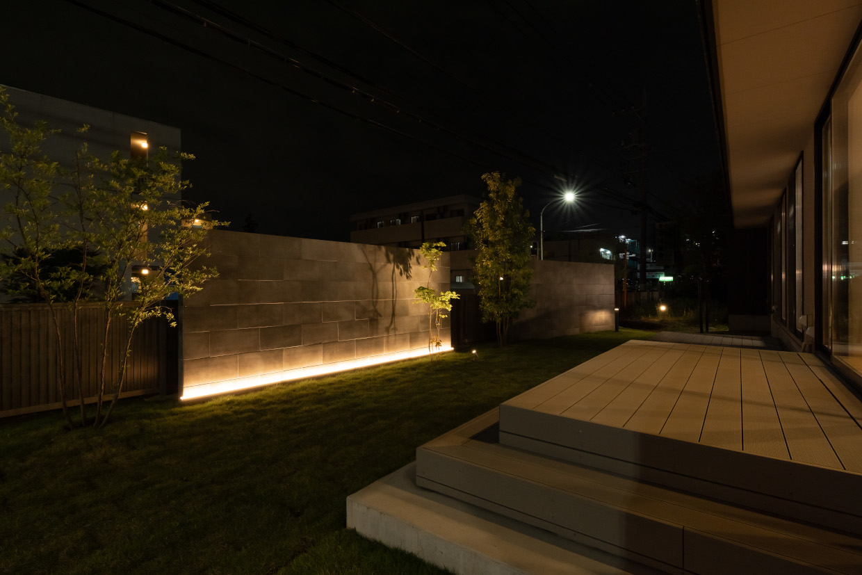 構造物を光で浮かび上がらせることで、奥行き感が生まれ、夜でも庭の広がりを感じられる効果をもたらします。
