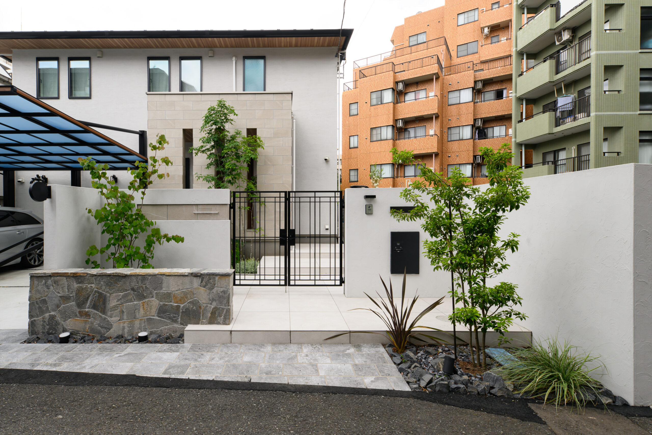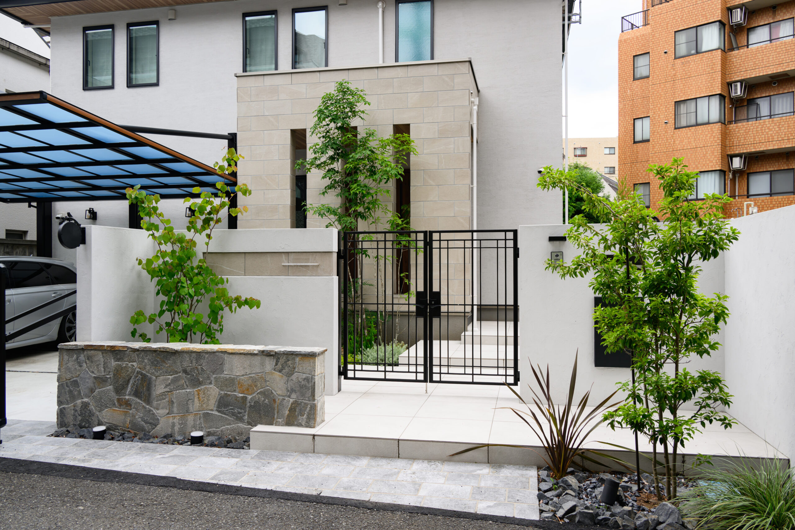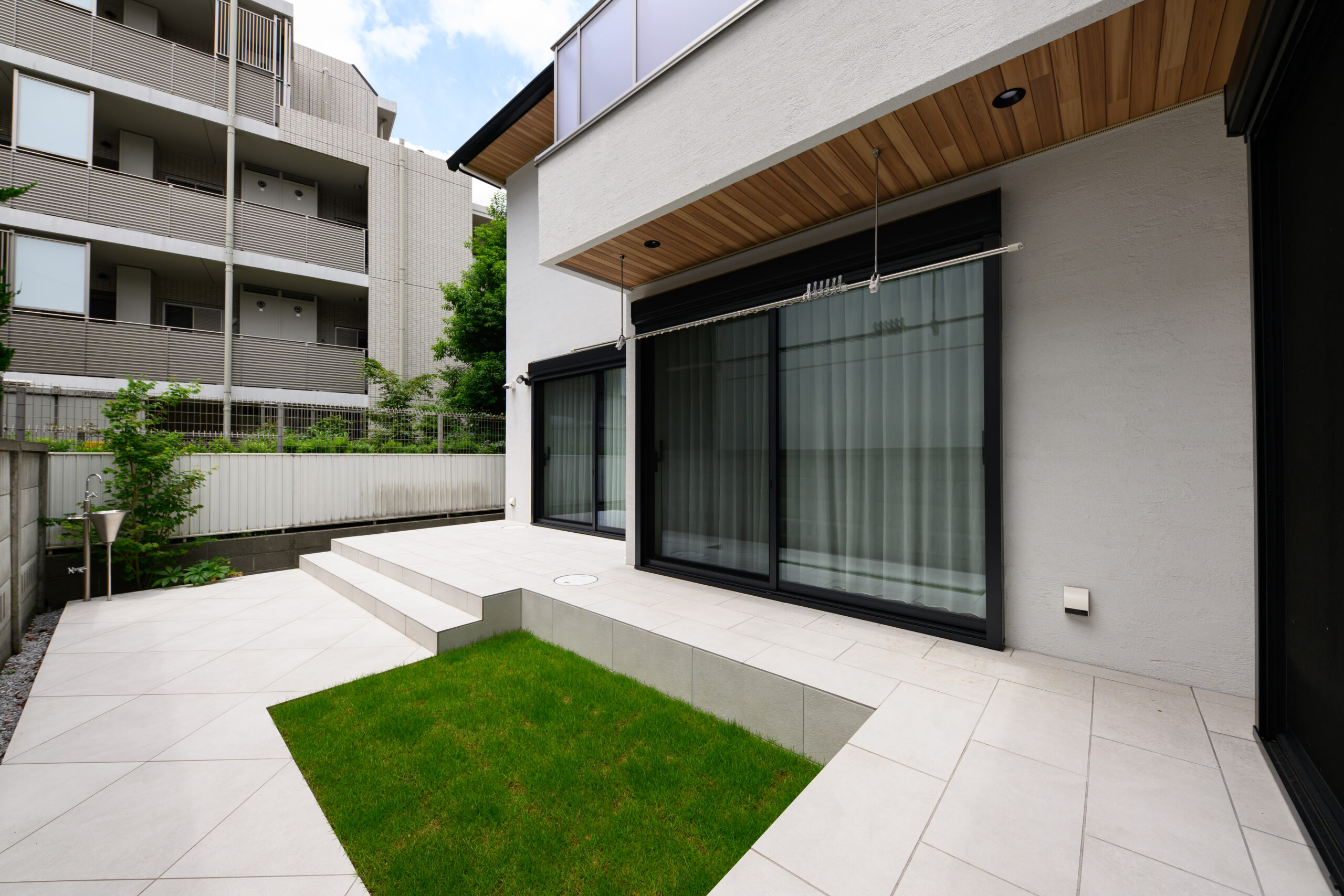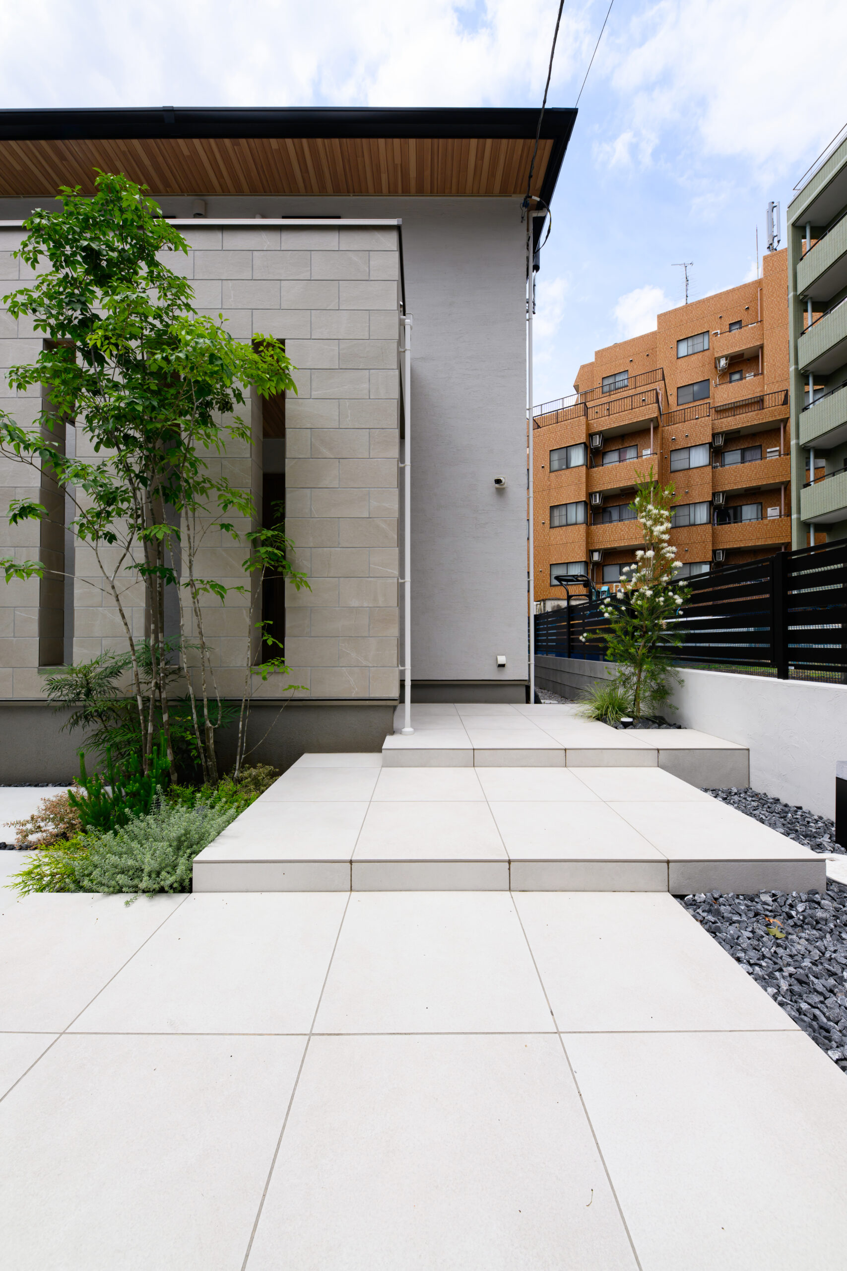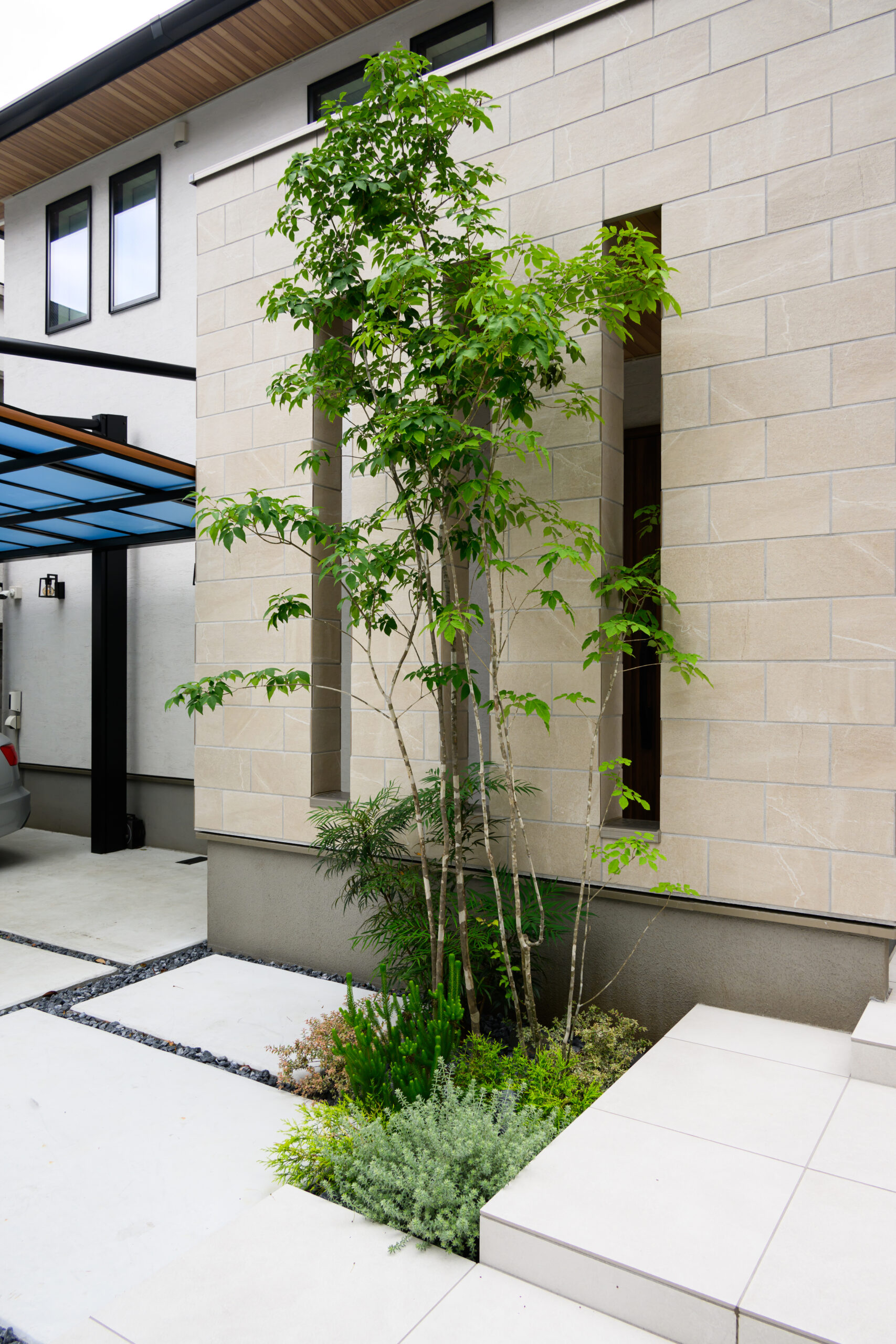 白を基調とした上質な外構空間。建物との調和を大切に、明るく清潔感のある素材で統一したアプローチが印象的です。ゆったりとしたステップを設けた玄関までの動線は、広がりと奥行きを感じさせ、足元のタイルと緑がやさしく迎えます。玄関前にはアオダモを配植し、季節ごとの表情の変化を楽しめる植栽計画を採用。リビング前のタイルデッキは段差を工夫して、庭との一体感を高めています。芝生を取り入れた緑のスペースは、お子様が遊んだり、家族で過ごす時間に寄り添い、日常を豊かにする屋外空間です。細部にまで気配りの行き届いた、品のある佇まいの外構デザインです。