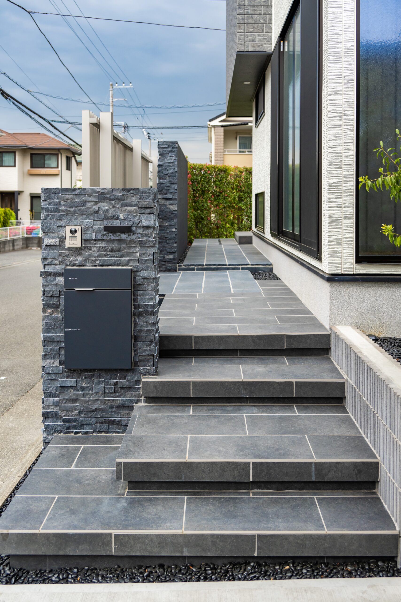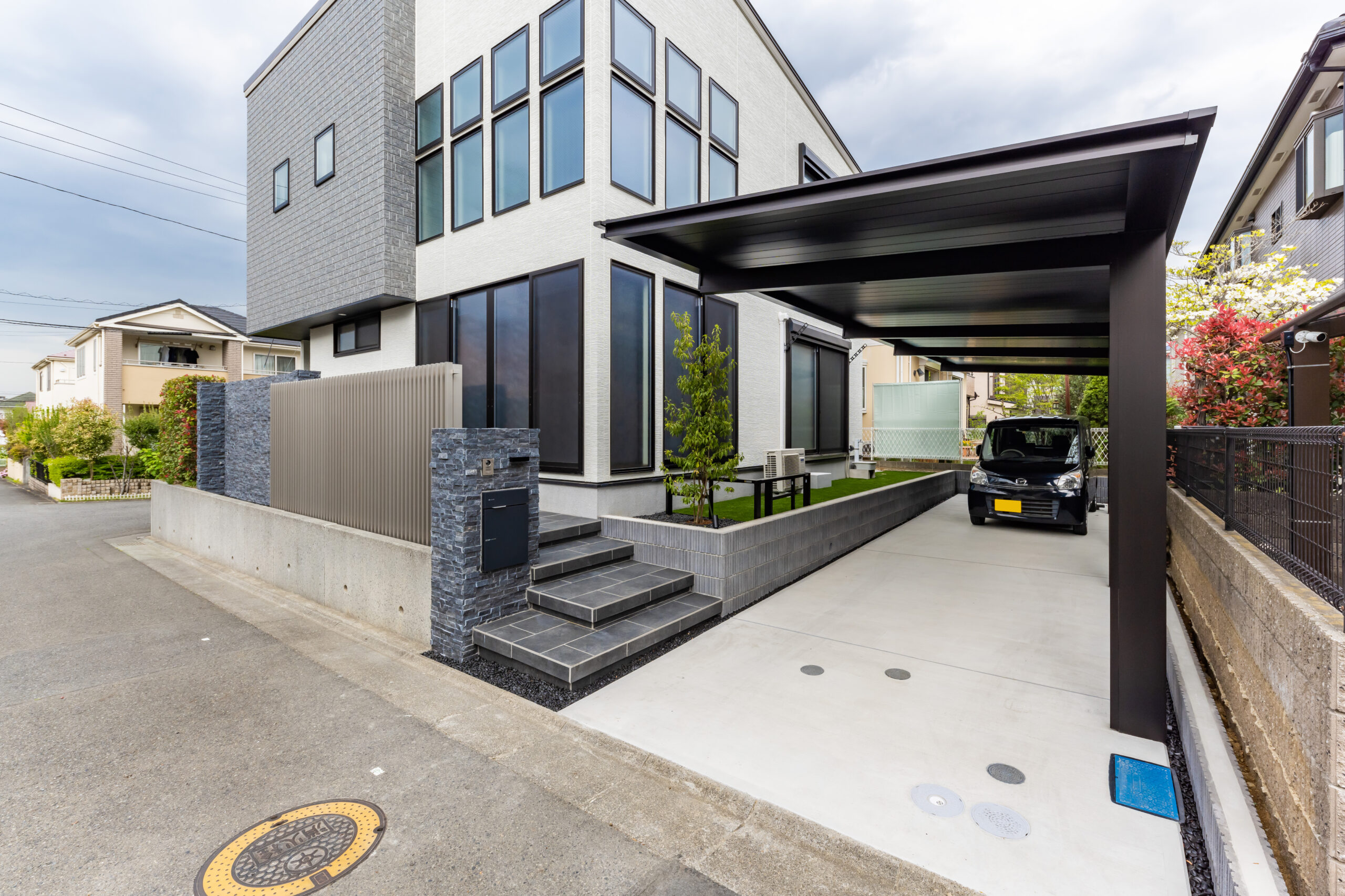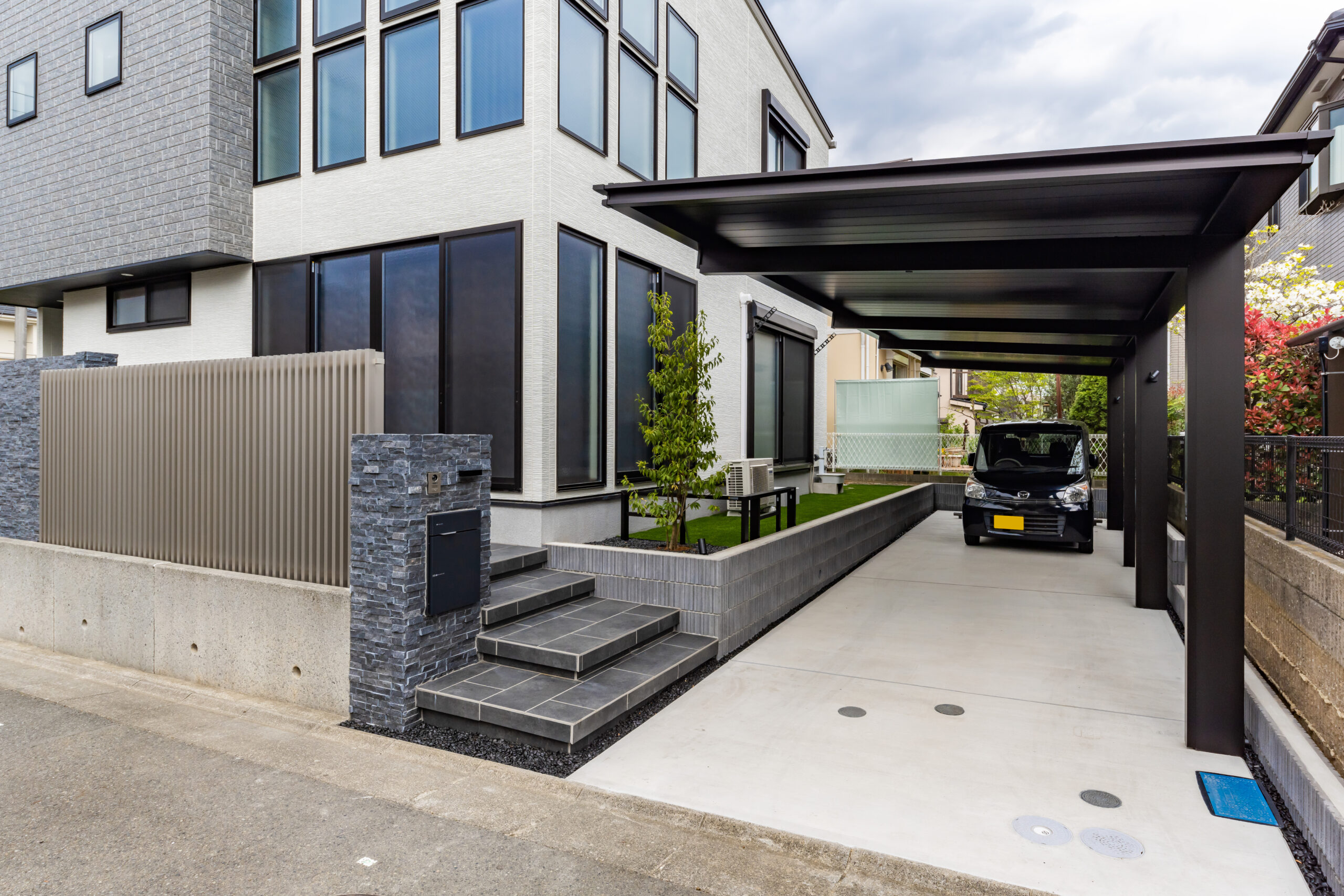 白と黒のコントラストでまとめたスタイリッシュな玄関アプローチ。建物の外観に合わせ、玄関まわりのタイルやカーポートをモノトーンで統一し、設計全体の印象を整えました。浮き階段の下に配したライン照明が、夜のアクセントとして空間にリズムを与え、YKK APのアルミ目隠しスクリーンフェンスや化粧ブロックのデザインが細部の質感を高めます。カーポートは奥行きのある縦列モデルを採用し、人感センサー付きライトが安全性と使い勝手を両立。ソヨゴの常緑植栽が季節の彩りを添え、住まいの顔となるエクステリアに仕上げました。