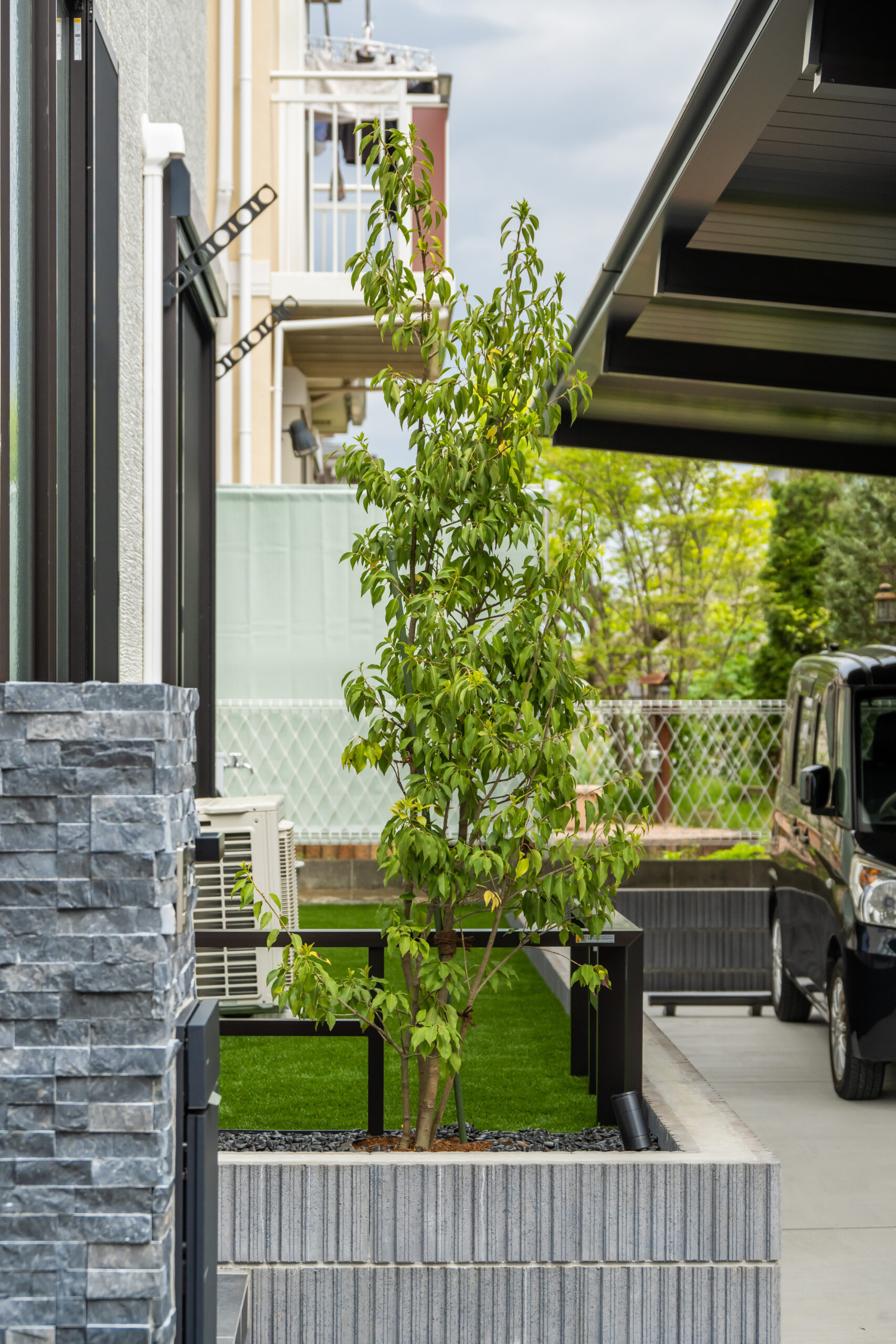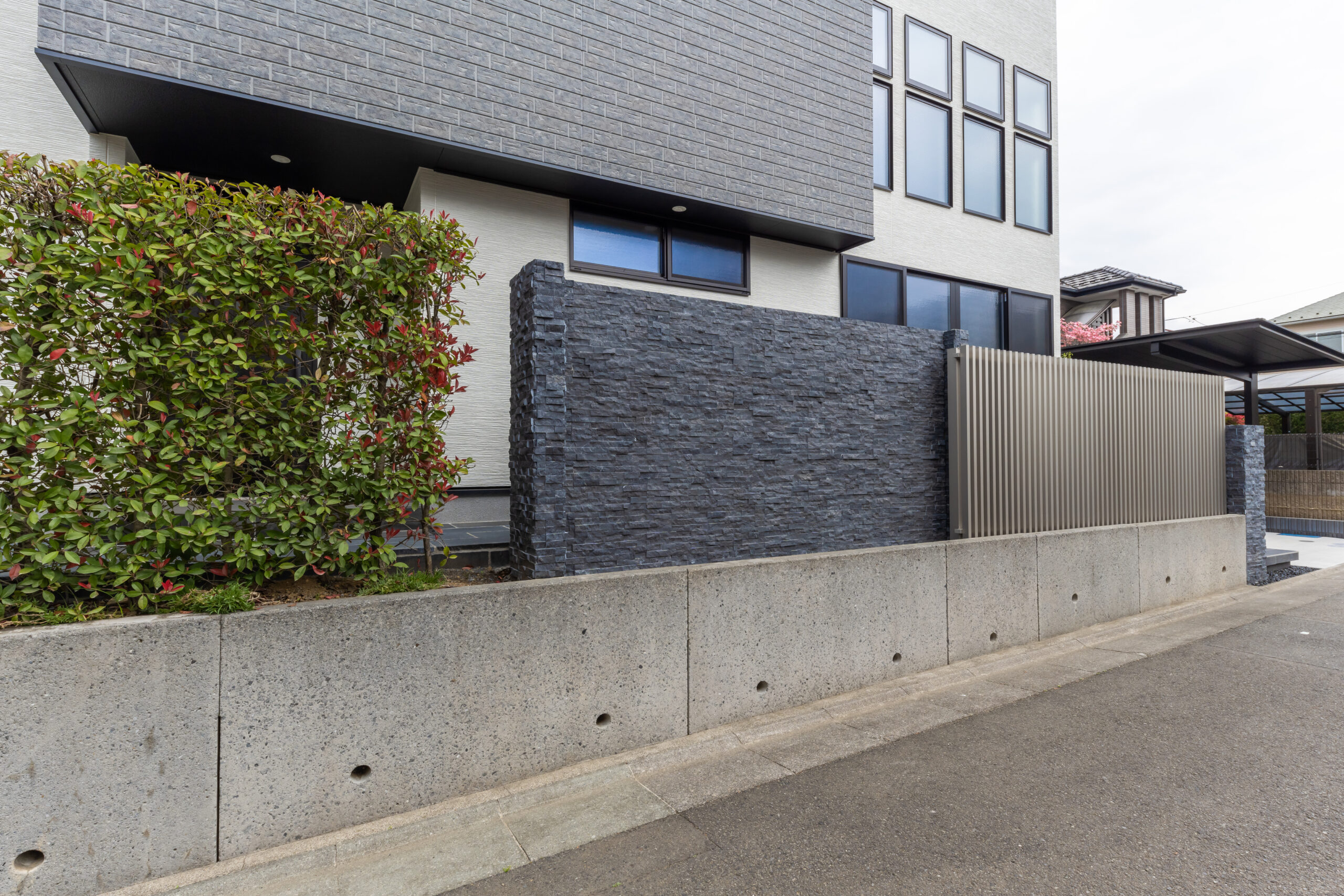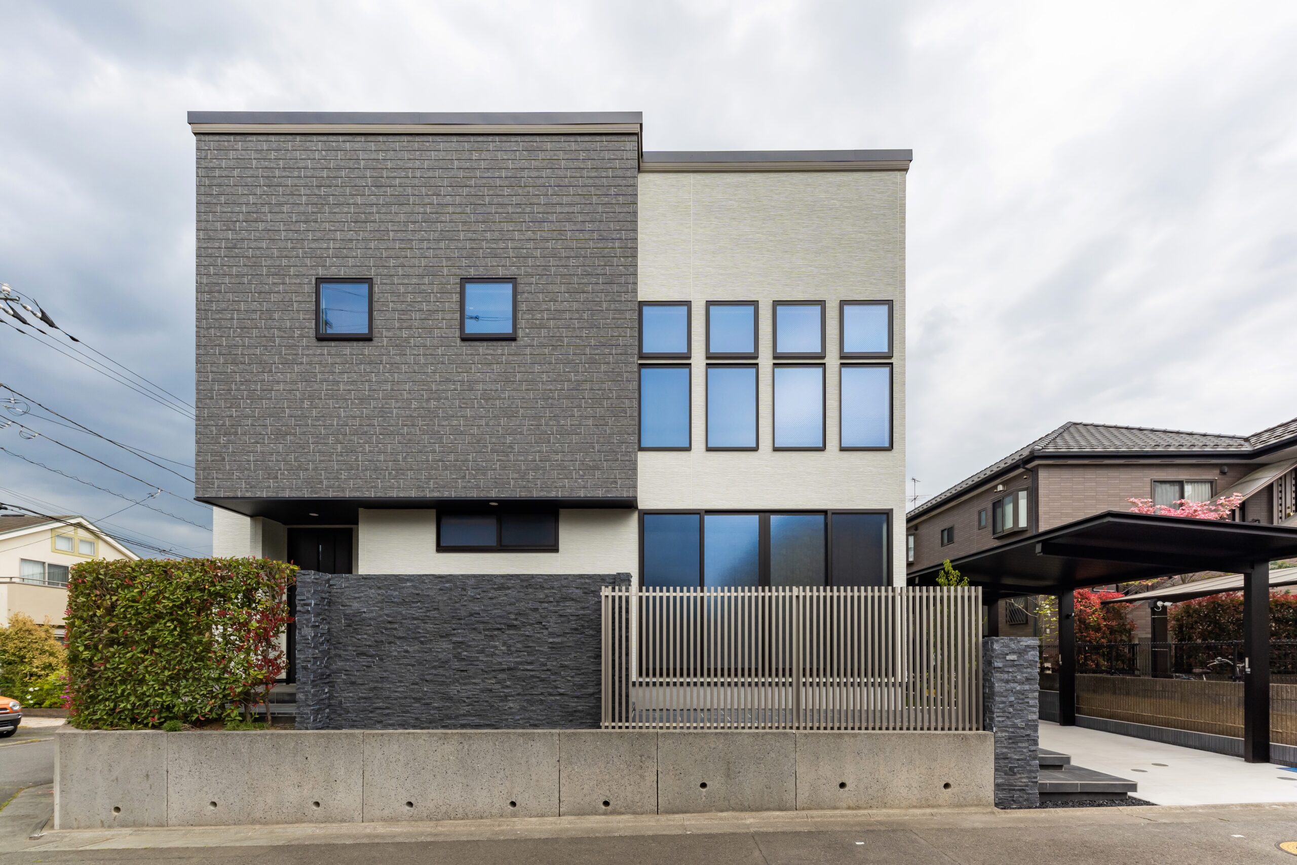 白と黒のコントラストでまとめたスタイリッシュな玄関アプローチ。建物の外観に合わせ、玄関まわりのタイルやカーポートをモノトーンで統一し、設計全体の印象を整えました。浮き階段の下に配したライン照明が、夜のアクセントとして空間にリズムを与え、YKK APのアルミ目隠しスクリーンフェンスや化粧ブロックのデザインが細部の質感を高めます。カーポートは奥行きのある縦列モデルを採用し、人感センサー付きライトが安全性と使い勝手を両立。ソヨゴの常緑植栽が季節の彩りを添え、住まいの顔となるエクステリアに仕上げました。