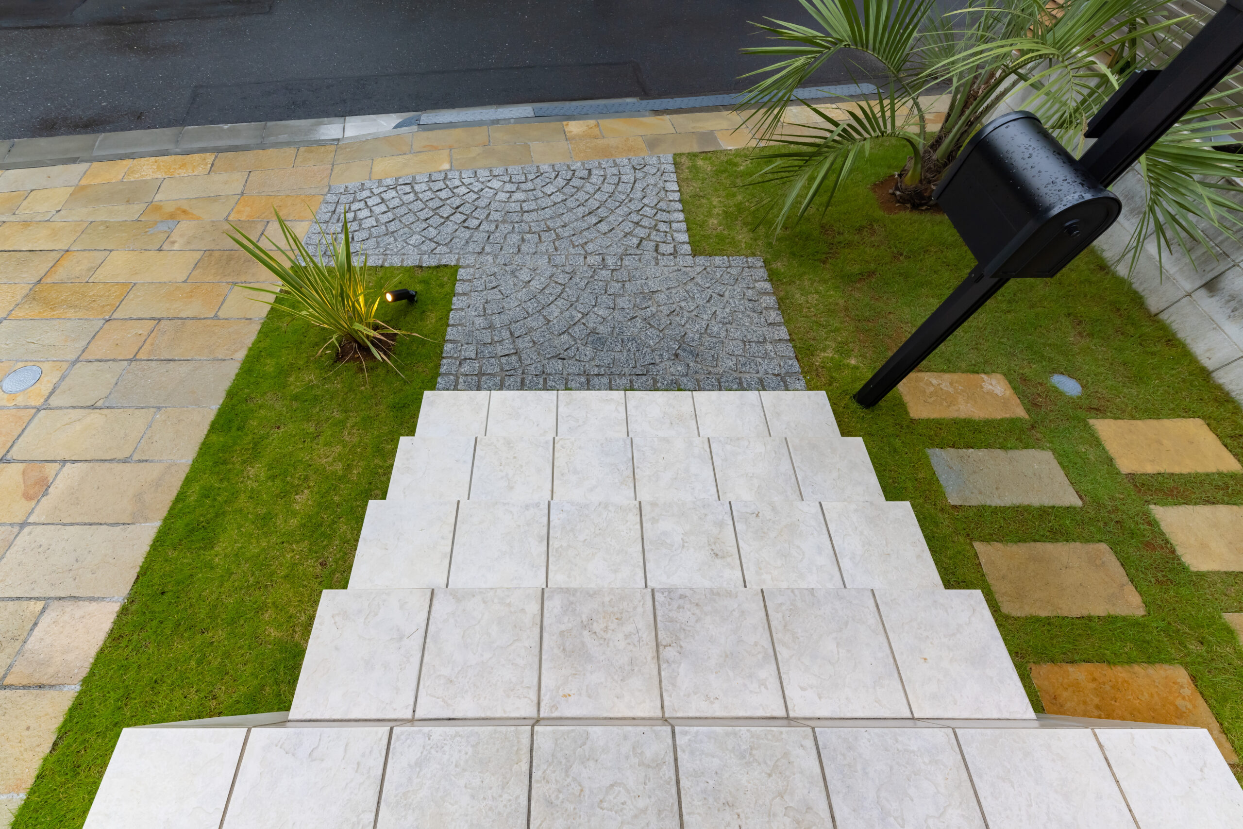 • アプローチまわりは、芝生とココスヤシを植え、暖かで陽気な気候の雰囲気を演出します。石畳は扇形に形を作り、アプローチのアクセントとなります。1つ1つ向きを変え慎重に施工しました。