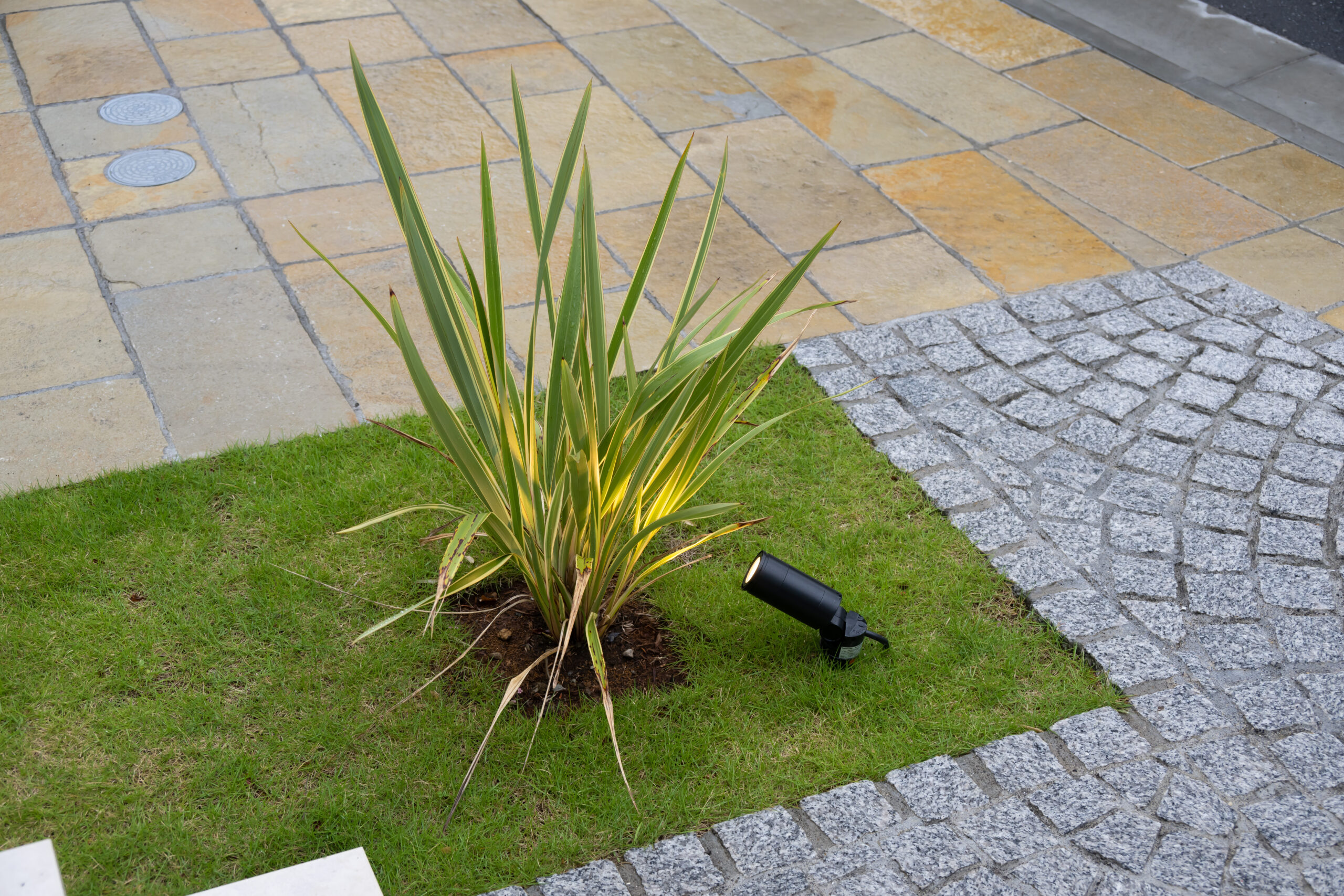 • 黄緑色のニューサイランの脇には、スポットライトを設置し夜になると、植物が光を浴びます。
