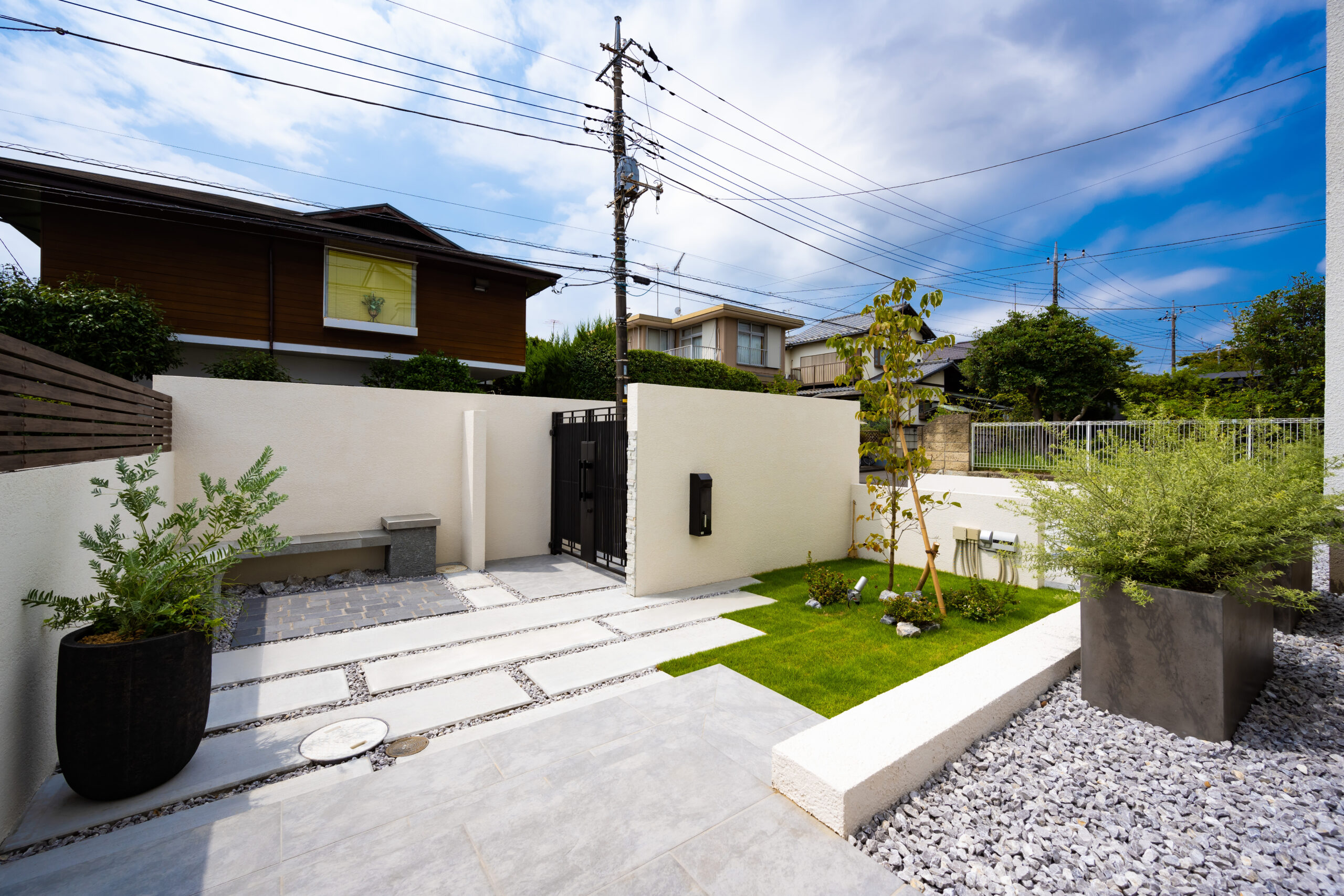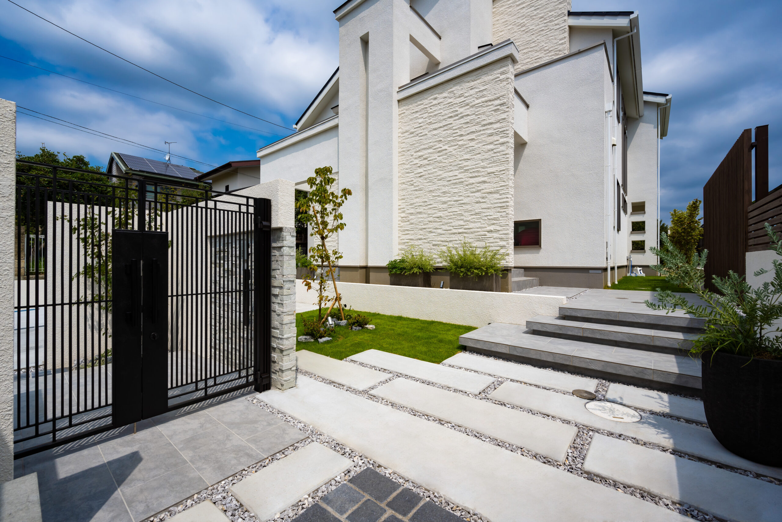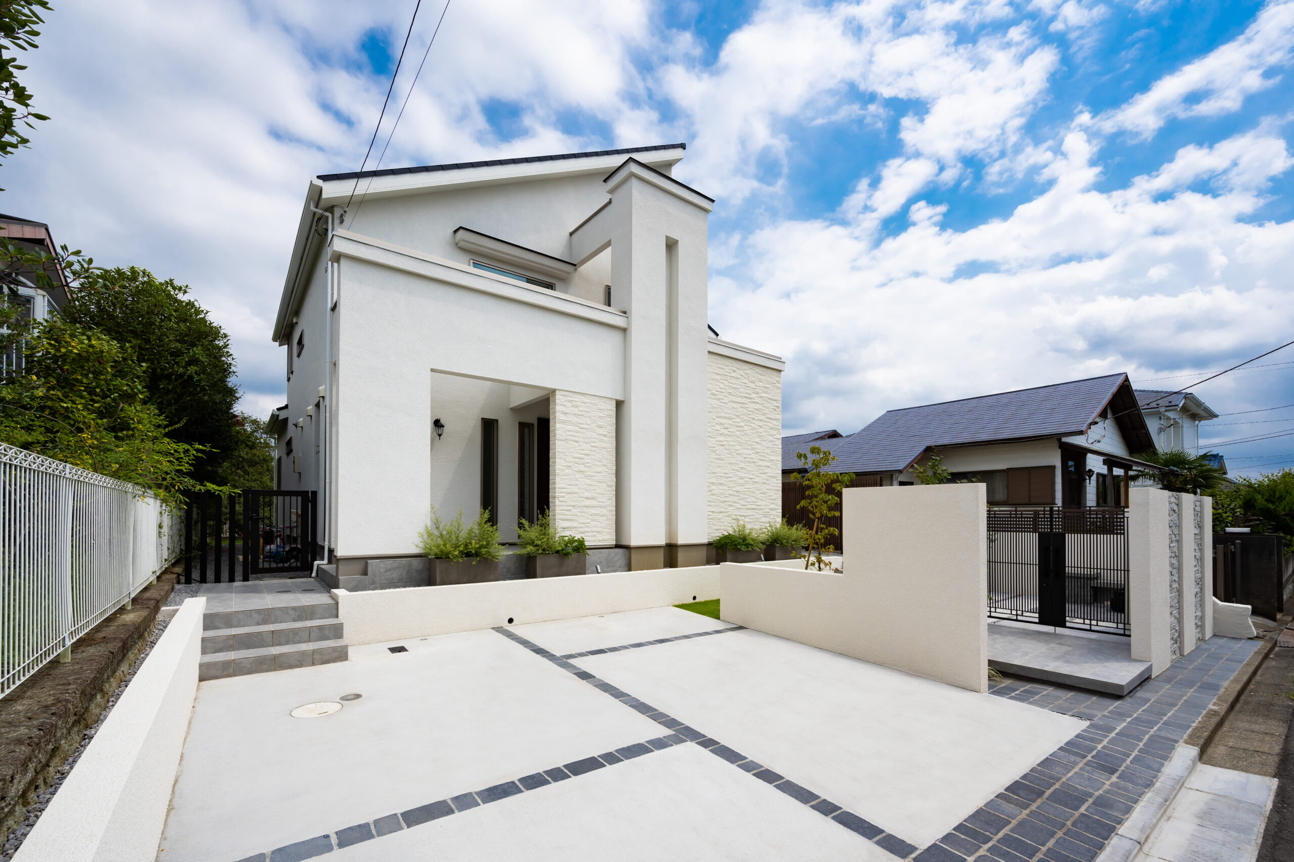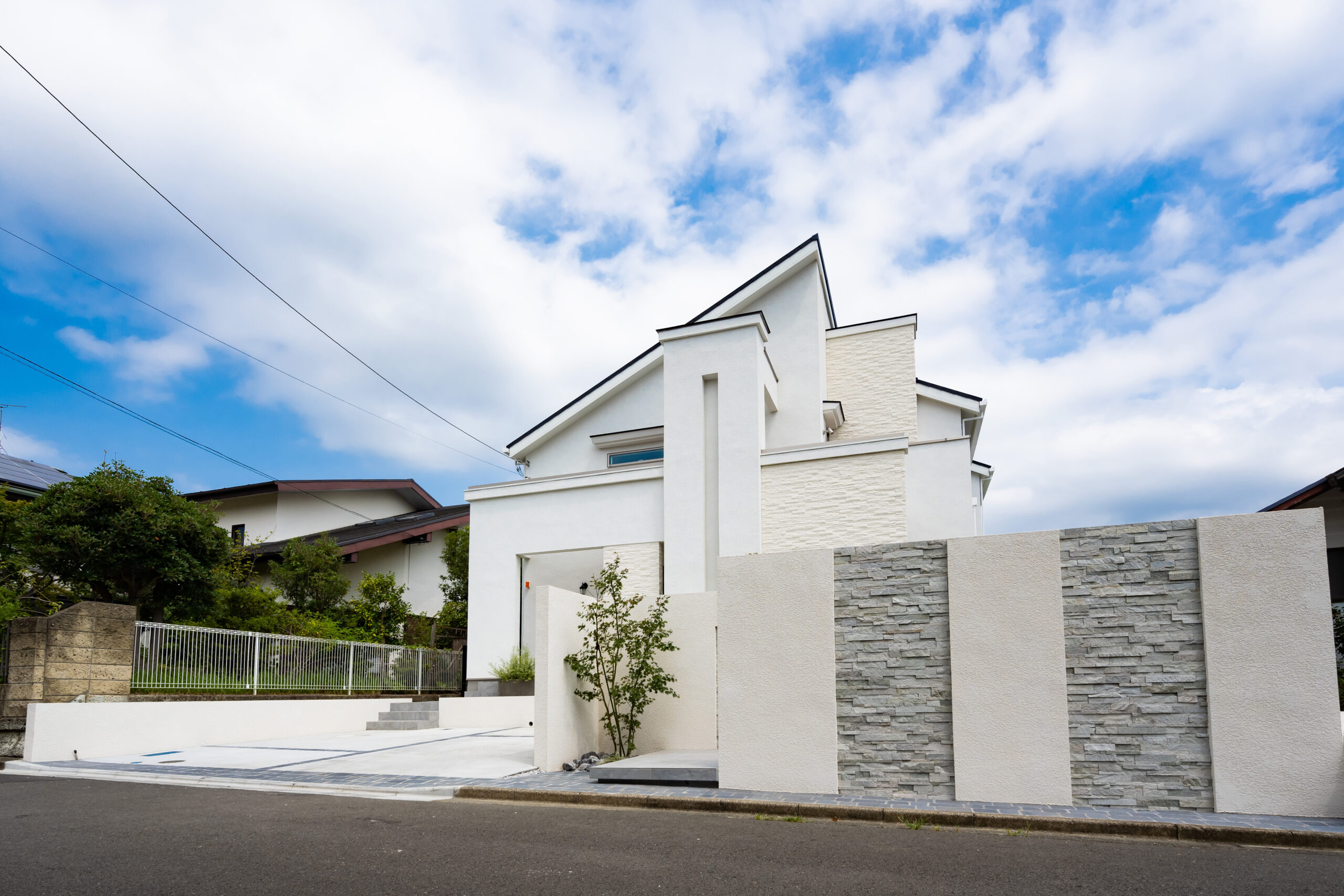 • 道路から見た全景写真です。左側が駐車場スペースで、右側が門柱とアプローチへ続く入口です。白色の家の雰囲気に合うように、門柱、石張りのデザインを施しました。門まわりは壁を手前遠くに立て、奥行感を演出するとともに道路に対して直角に入口を設けることで、敷地内が丸見えにならないようにしております。浮き階段もデザイン性を高めるポイントの1つです。