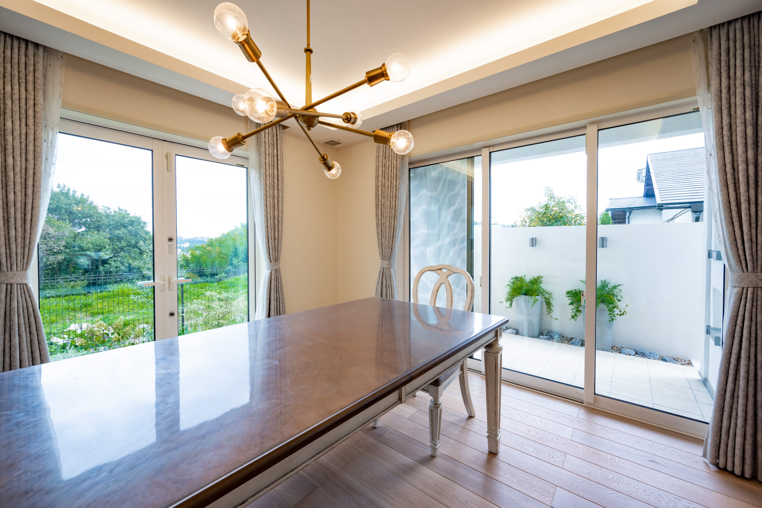 • ダイニングからお庭を見た様子です。タイルデッキと目隠し壁を施工いたしました。壁の手前には背の高いポットをご提案いたしました。品のよい雰囲気を演出できますね。