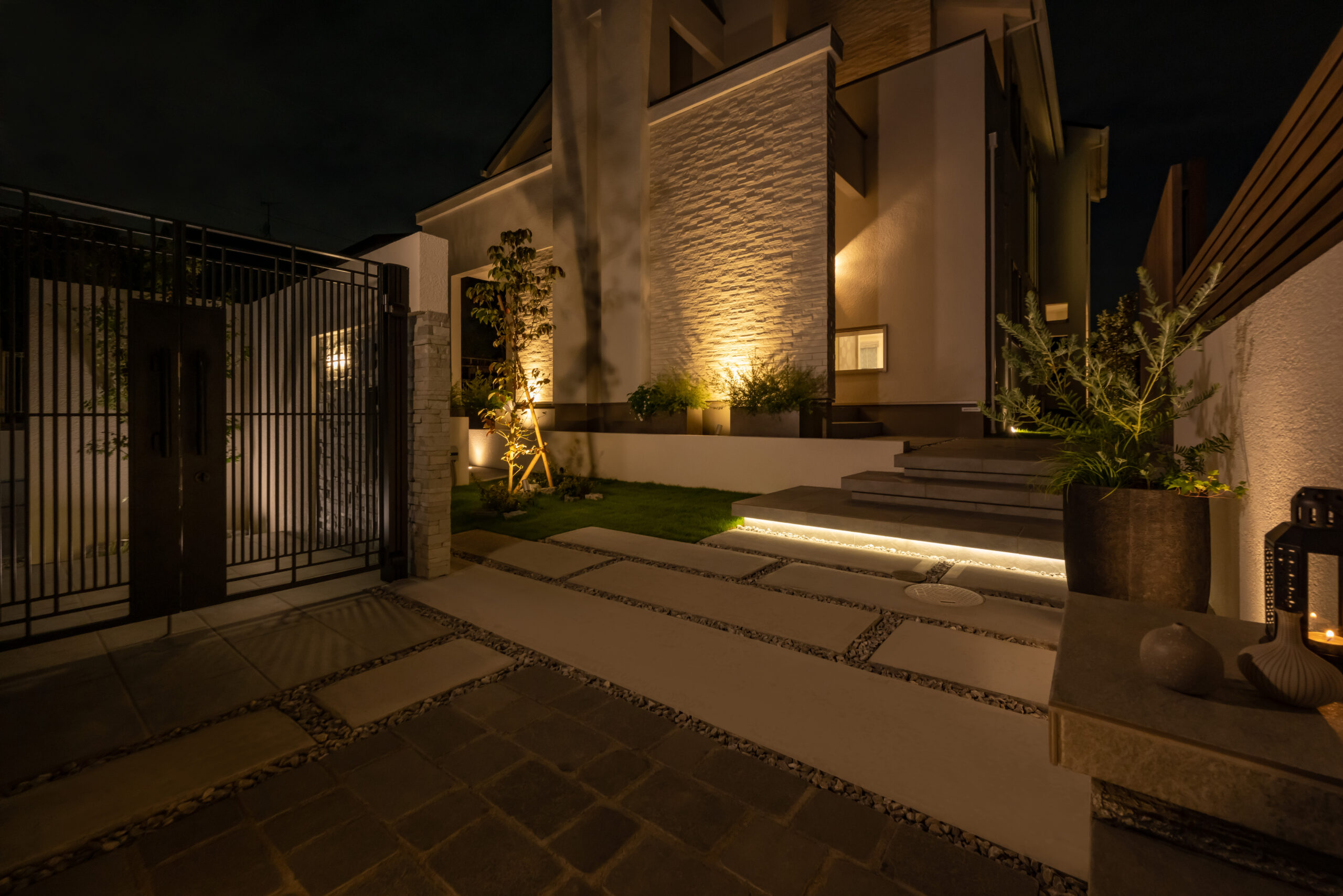 • ライティングはスポットライトやグランドライト、間接照明など照明器具を幅広く取り入れ、夜景が美しいデザインとなりました。建物外壁を照らす光を設置し外構と建築物側の光のバランスをとりました。手前側の壁はグランドライトにより自然石の質感と陰影が浮かびあがります。門まわりの階段には間接照明をいれ、浮き階段を強調させます。