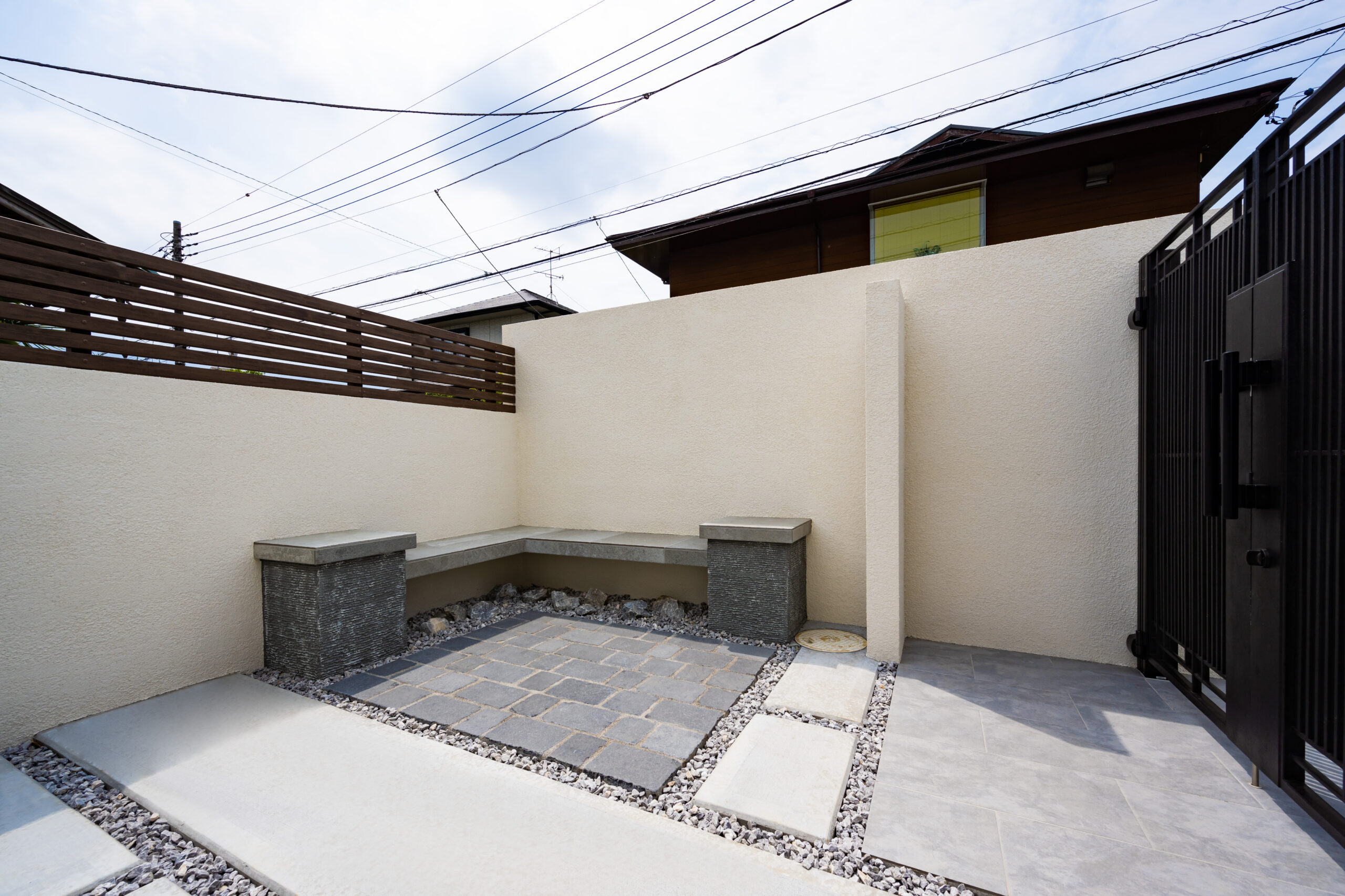 • お子様方がお庭で遊んでる時や、ちょっとした来客時等には、ベンチに座って落ち着いていただけます。目隠し壁とフェンスもしっかり機能しています。