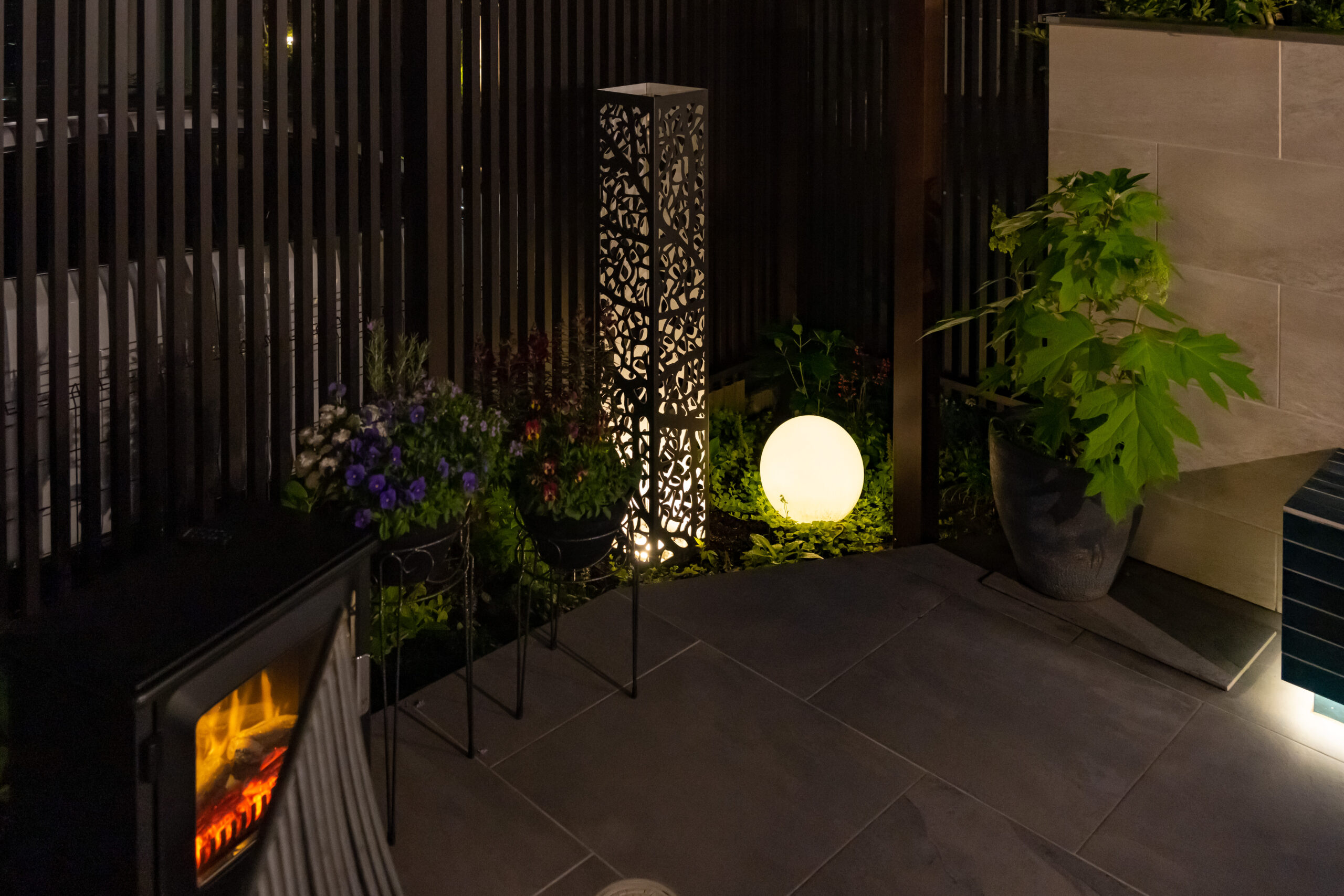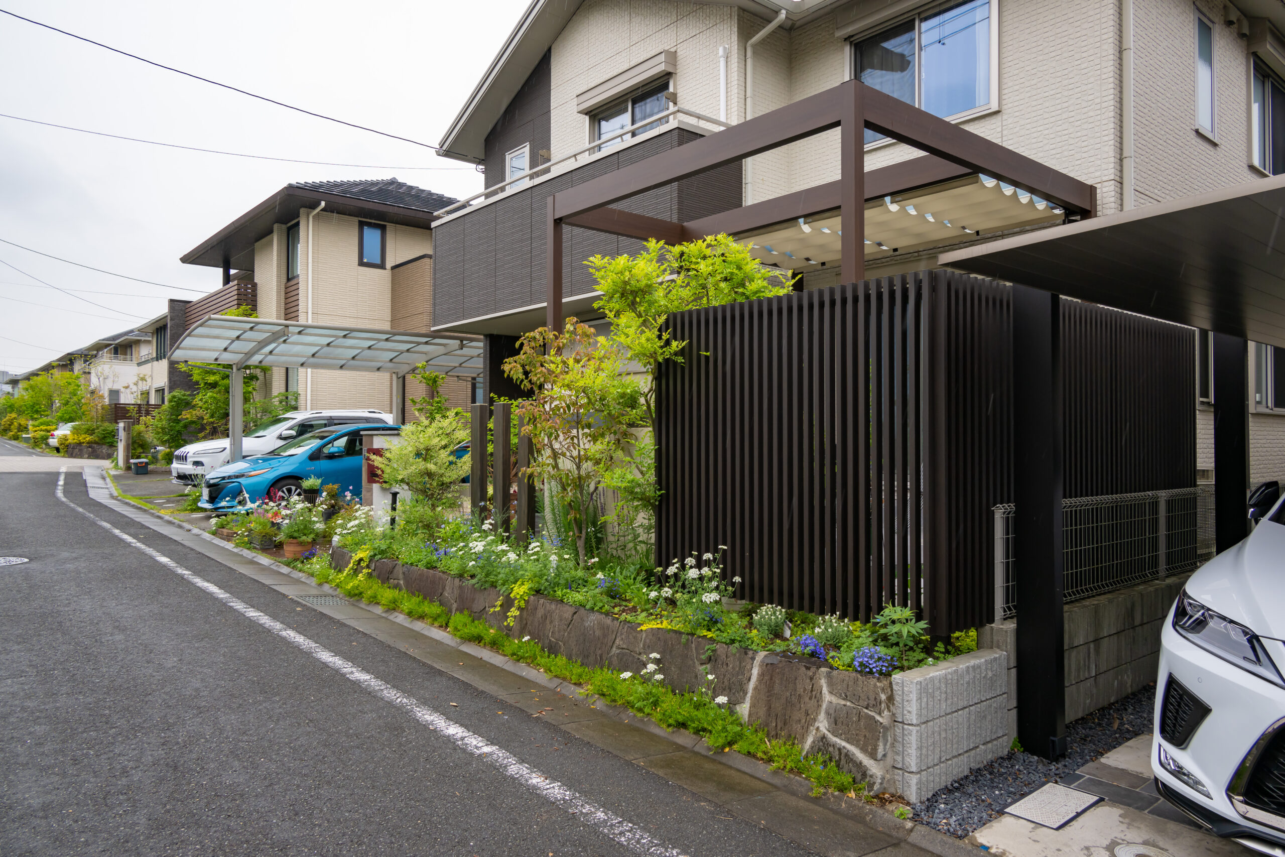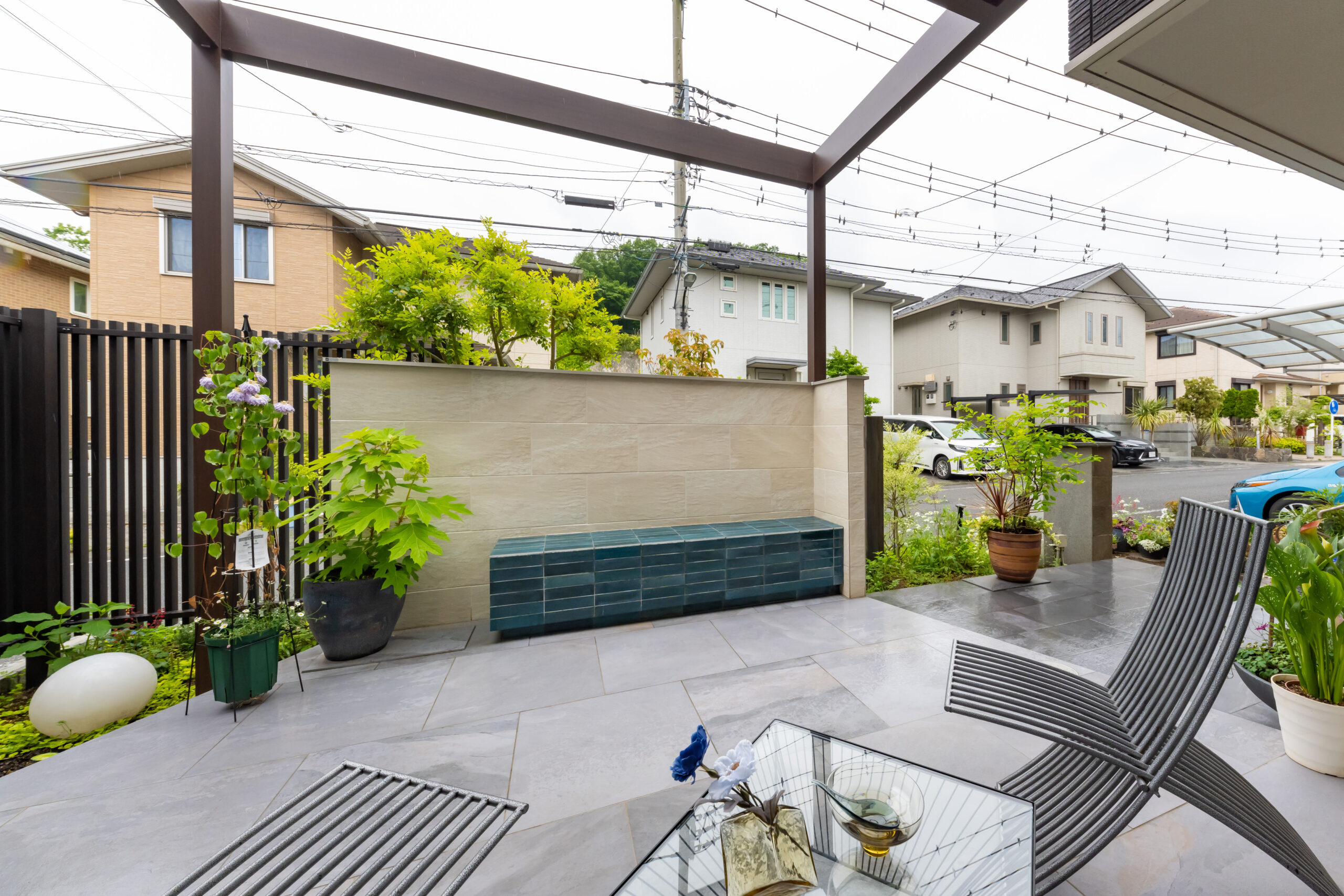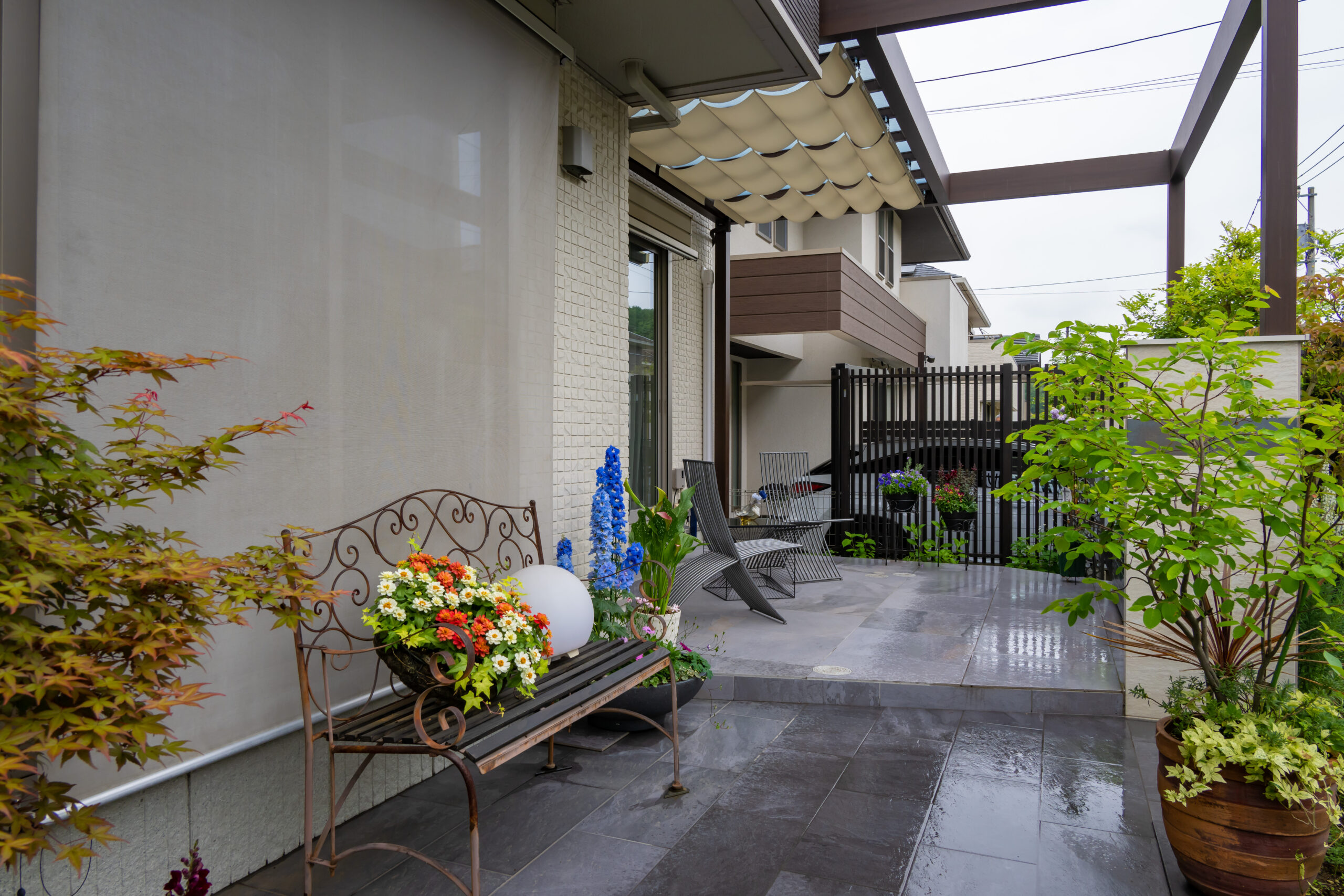 シックな色調と屋根付きのタイルテラスが印象的なリガーデンです。手入れが大変だった芝生の庭を、ゆったり過ごせるメンテナンスフリーのテラスへと一新し、お施主様お気に入りのモザイクタイルをアクセントにしました。屋根付きパーゴラが日差しをやわらげ、リビングからの動線を自然につなぐ空間は、ガーデニングや椅子に座って過ごす時間を心地よく演出します。道路側の視線をほどよく遮る縦格子フェンスは、道路からの光も取り込みつつ、夜にはこだわりの照明が外構と植栽をやさしく照らします。昼とは異なる表情を見せる庭は、お庭の時間をより豊かにするリフォームです。
